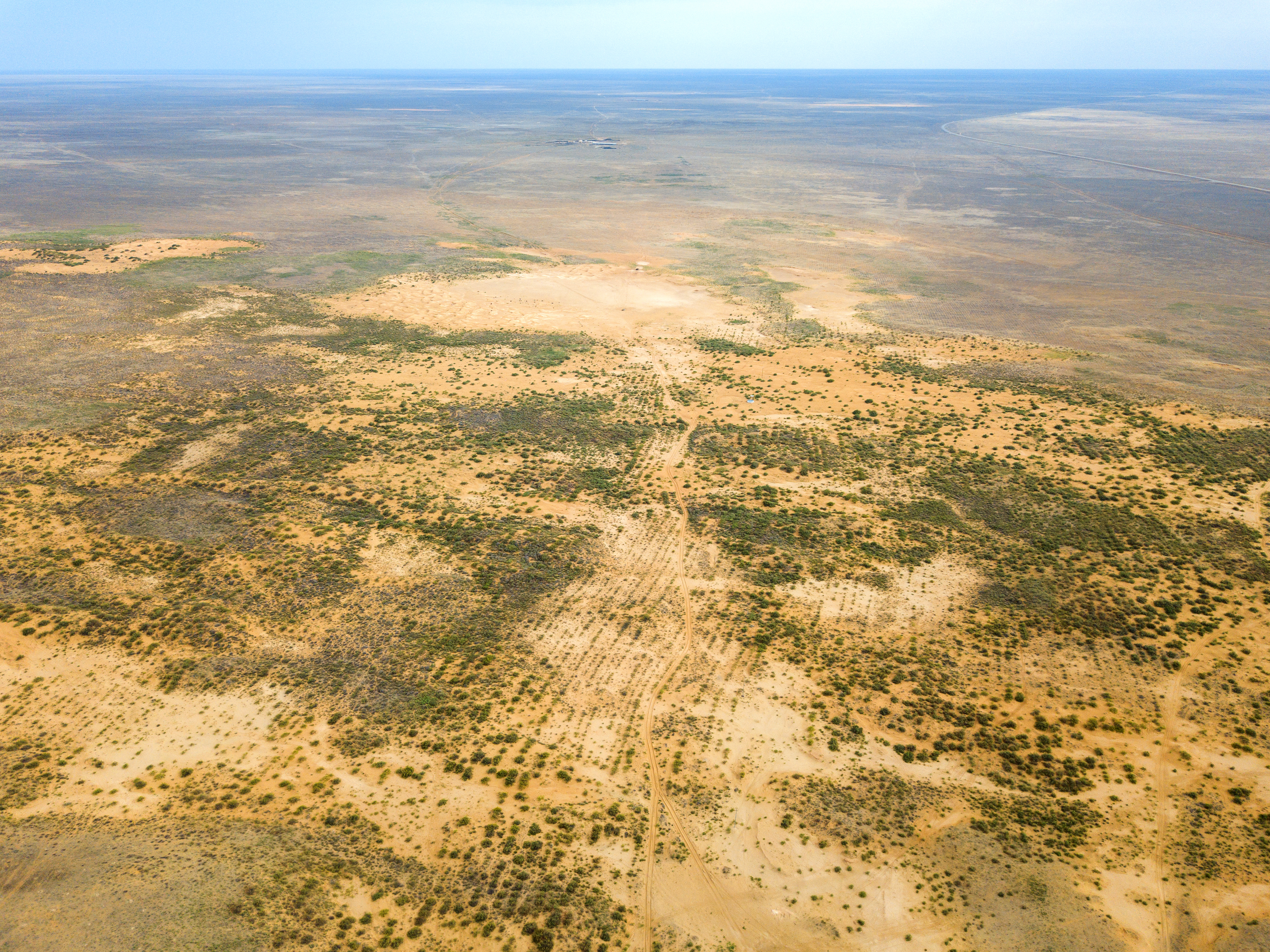 The texture of the land is a focal point: sandy dunes intertwine with areas of denser, sun-scorched vegetation. Traces of human activity can be observed – faint tracks from vehicles cutting through the sandy soil, hinting at the presence of life and activity in this seemingly desolate place. These lines create a geometric pattern against the backdrop of nature's organic chaos, adding an intriguing contrast.