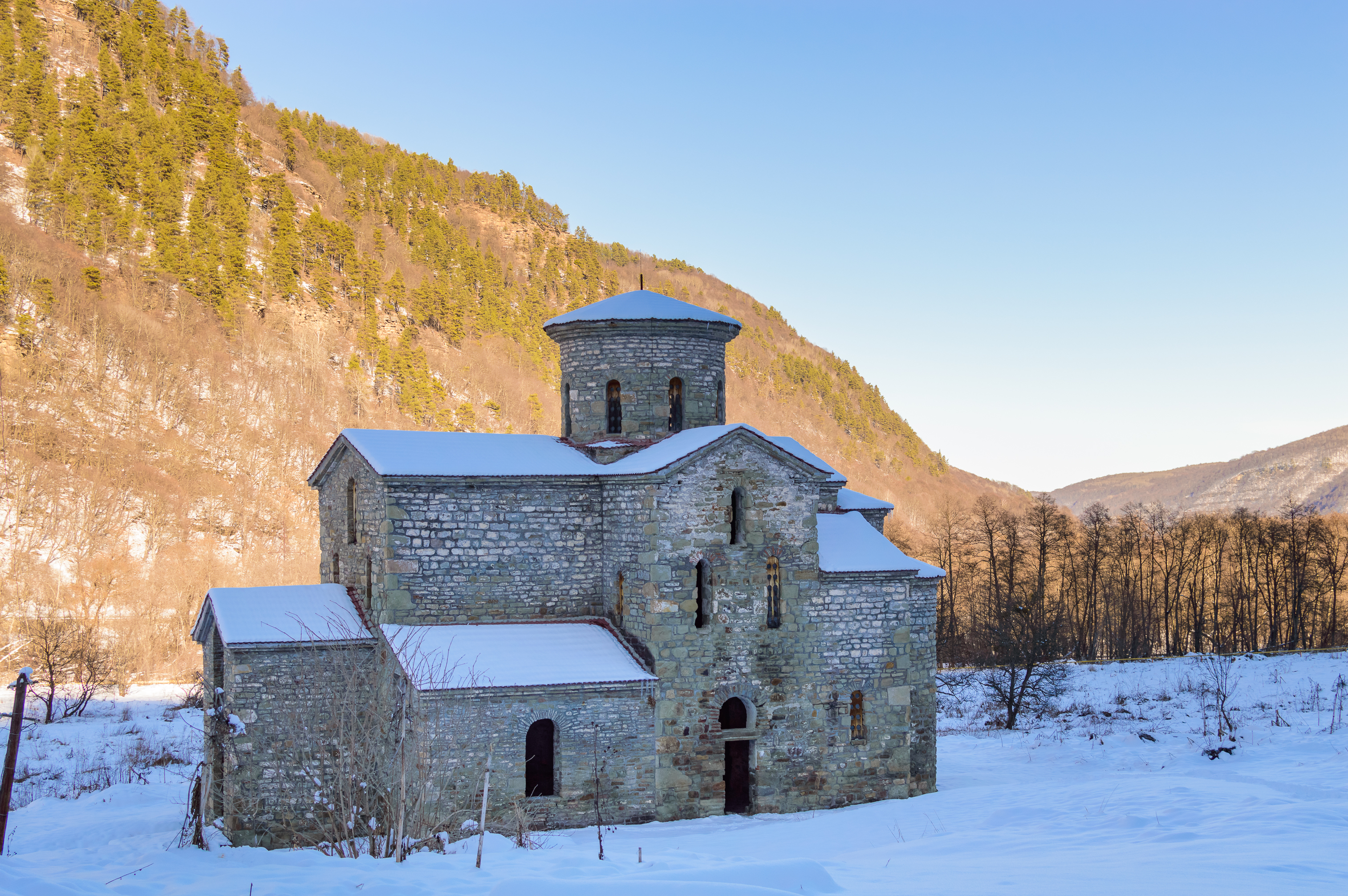 Окружающий пейзаж подчеркивает уединенность и духовность этого места. Склоны гор, покрытые лесом, создают живописный фон, а голые деревья на переднем плане добавляют графичности и подчеркивают зимнее настроение. Яркое дневное солнце освещает сцену, создавая мягкие тени и выделяя текстуру камня.