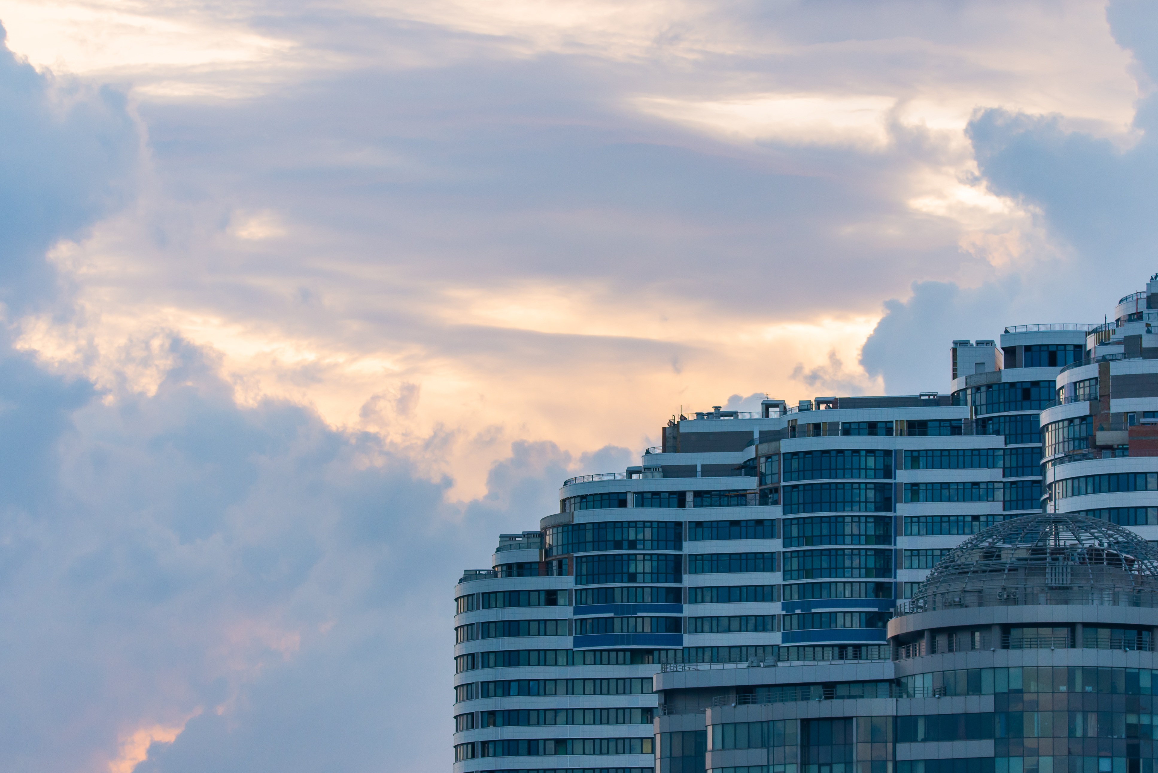 This shot captures the moment when modern architecture meets the natural beauty of a sunset sky. The multi-story building, with its wavy, stepped facades and abundant glass surfaces reflecting the last rays of the sun, creates an impression of dynamism and grandeur. The architectural lines curve smoothly, following the natural lines of the clouds, which in turn are colored in warm shades of golden and pink.