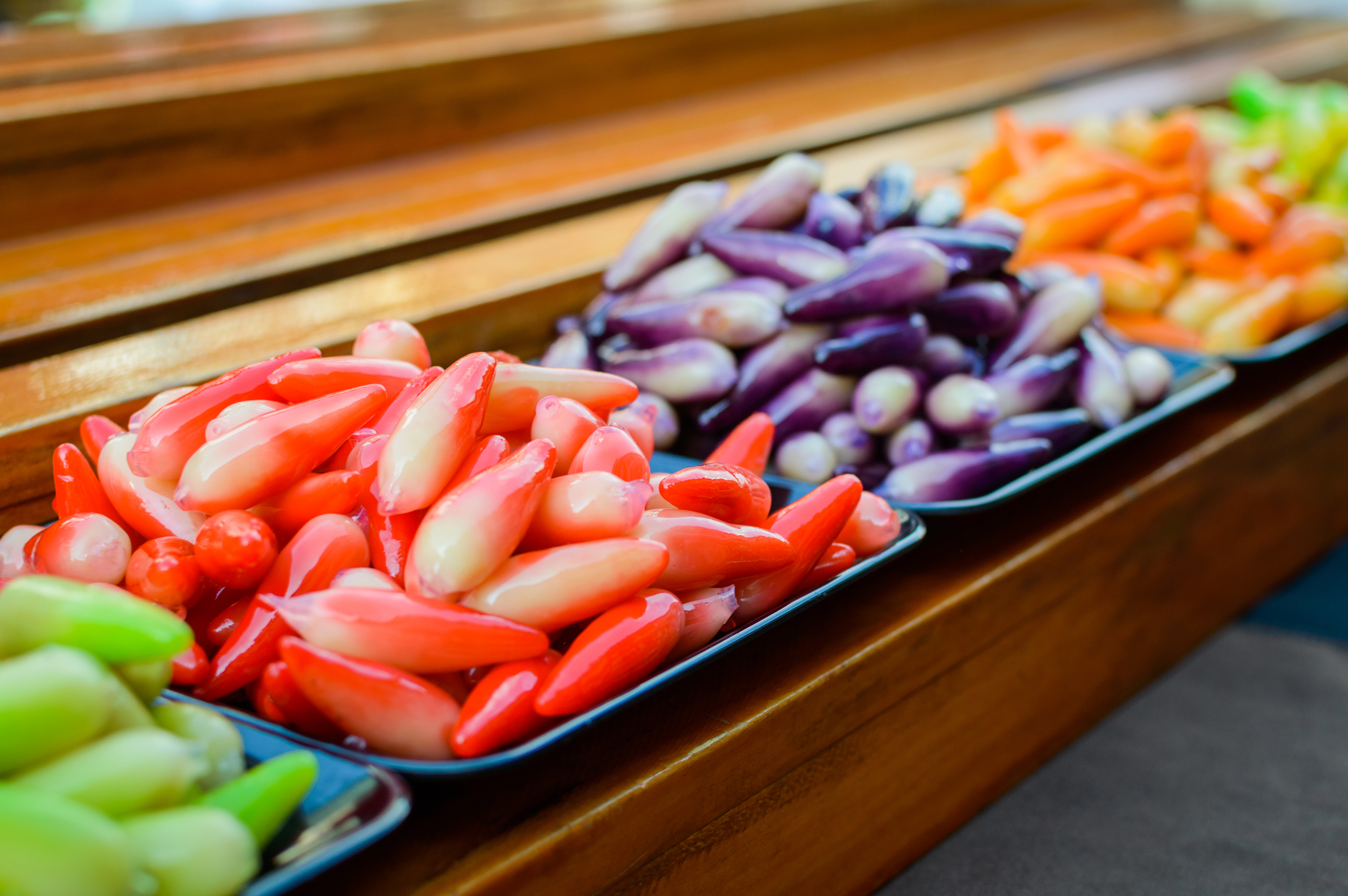 The sweets have a distinctive shape, resembling small fruits or vegetables, each coated in a shiny, smooth glaze that gives them an appealing, glossy appearance. The primary colors featured in the shot include vibrant red, deep purple, sunny orange, and soft green. Each color is unique and eye-catching, promising a variety of flavors and textures.