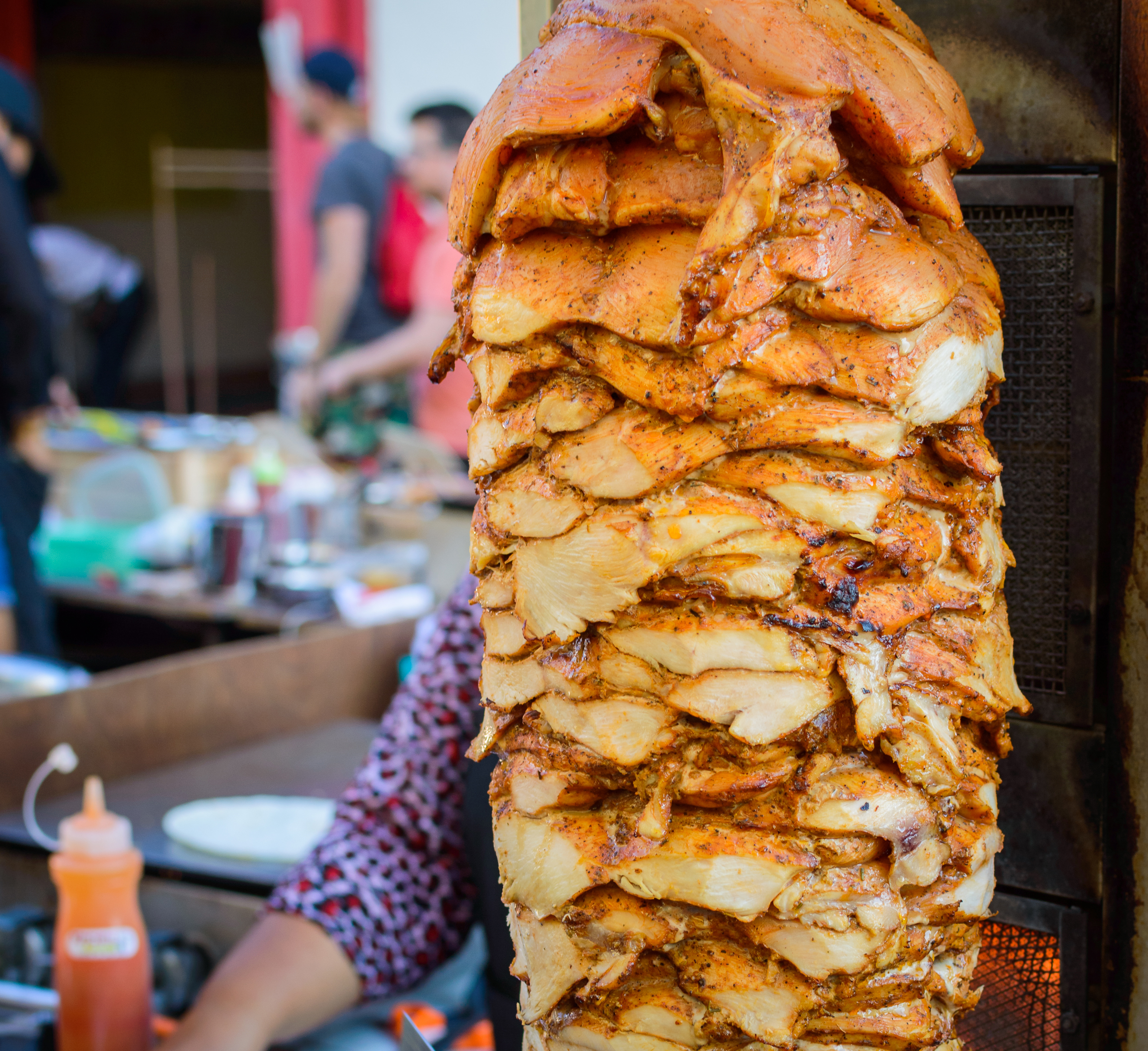 На этом изображении представлен крупный план вертикального гриля, на котором медленно вращается внушительная башня из нежных, сочных кусков курицы, приготовленных до идеальной золотисто-коричневой корочки. Каждый слой мяса искусно нарезан, демонстрируя аппетитные текстуры и специи, которыми оно было щедро приправлено. Тепло от гриля, видимое в нижней части изображения, придает сцене живую атмосферу, намекая на процесс приготовления, который обещает восхитительный вкус.