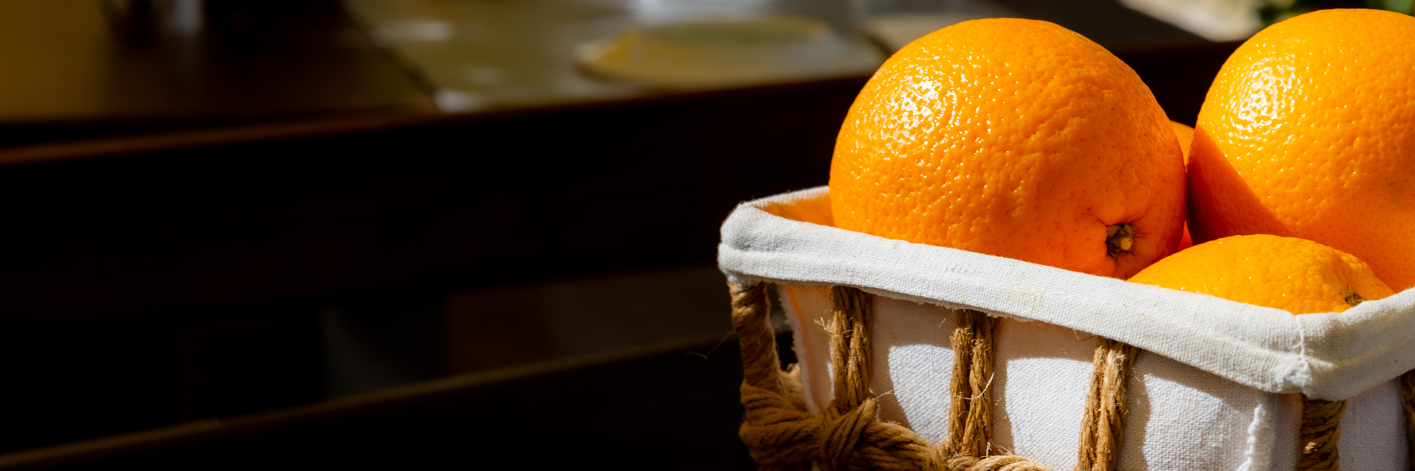 Изображение представляет собой аппетитный крупный план нескольких спелых, сочных апельсинов, уютно расположенных в плетеной корзине. Корзина имеет светлую тканевую подкладку и украшена грубыми веревочными ручками, что придает ей естественный и деревенский вид.