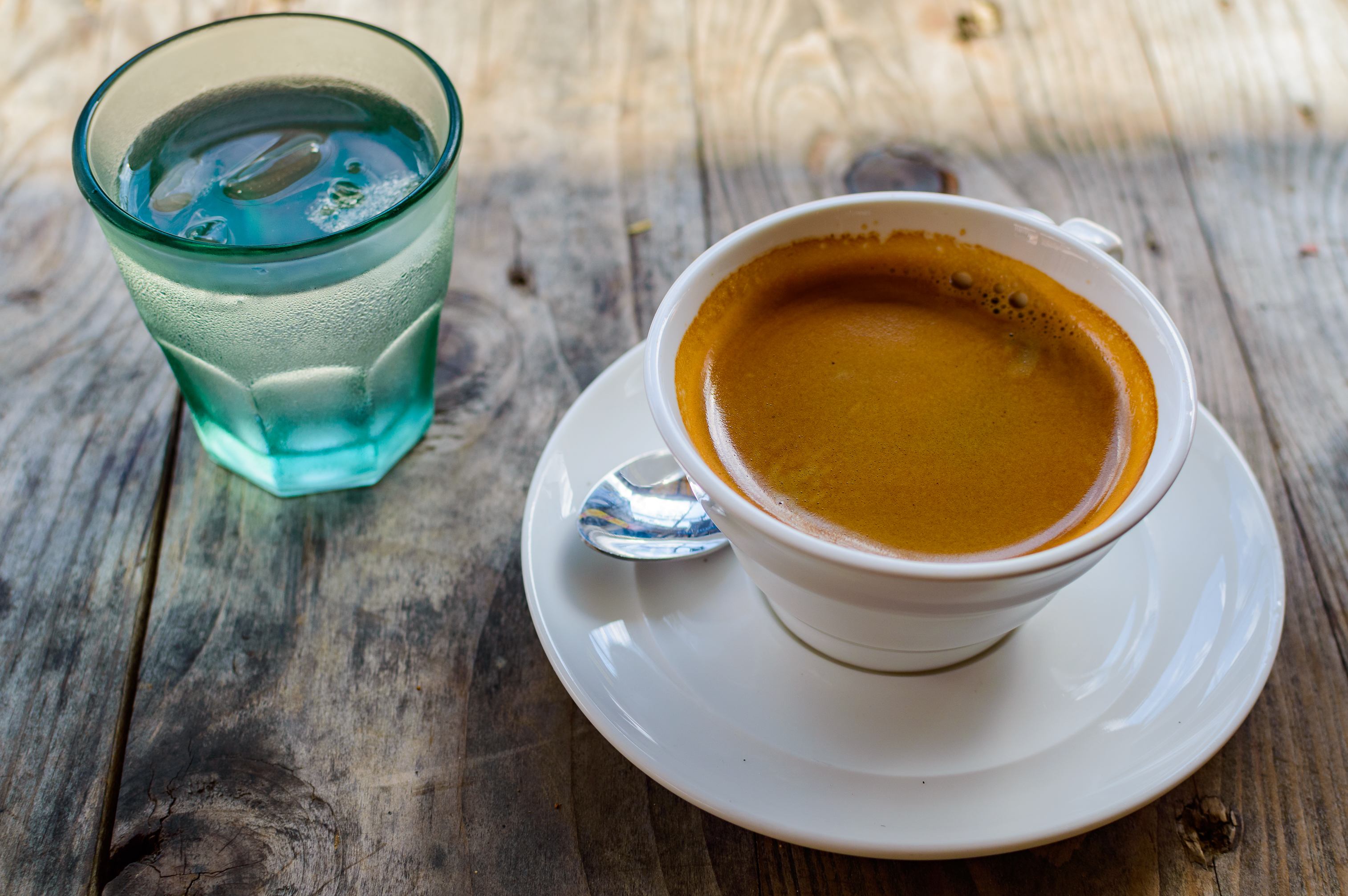 Оба напитка покоятся на поверхности старого, грубого деревянного стола. Его текстура с видимыми прожилками и трещинками создает ощущение натуральности и уюта, намекая на возможность отдыха на природе или в уютном кафе. Солнечный свет, падающий сверху, создает мягкие тени и подчеркивает детали, делая изображение живым и аппетитным. Композиция продумана до мелочей, фокусируя внимание зрителя на контрасте между горячим, бодрящим кофе и прохладной, утоляющей жажду водой, создавая идеальный баланс для приятного момента.