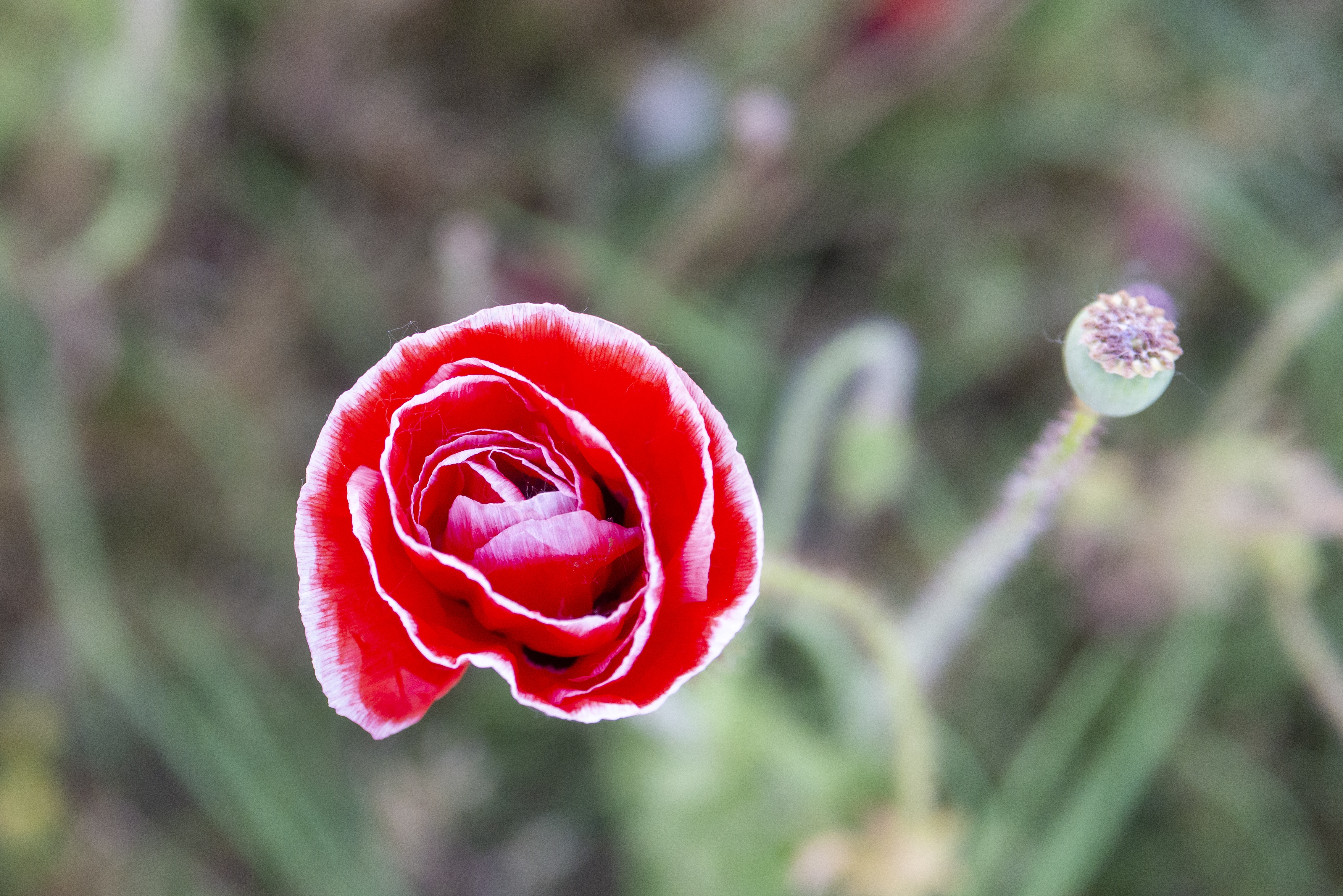 Это завораживающее фото представляет собой крупный план одного полностью раскрывшегося красного мака, выделяющегося на мягком размытом фоне естественного поля. Сцена разворачивается в дневное время года, вероятно, весной или ранней летой, когда мягкое солнечное освещение усиливает глубокие бордовые оттенки и нежные градиенты на лепестках. Композиция использует малую глубину резкости для изоляции объекта, делая его неоспоримым фокусом, при этом превращает окружающую зелень в мечтательный боке-эффект, добавляющий глубину и спокойствие к изображению. На заднем плане можно едва различить нераскрывшийся бутон мака и намёки на зеленые стебли, подчеркивая историю природного роста и сезонных циклов.