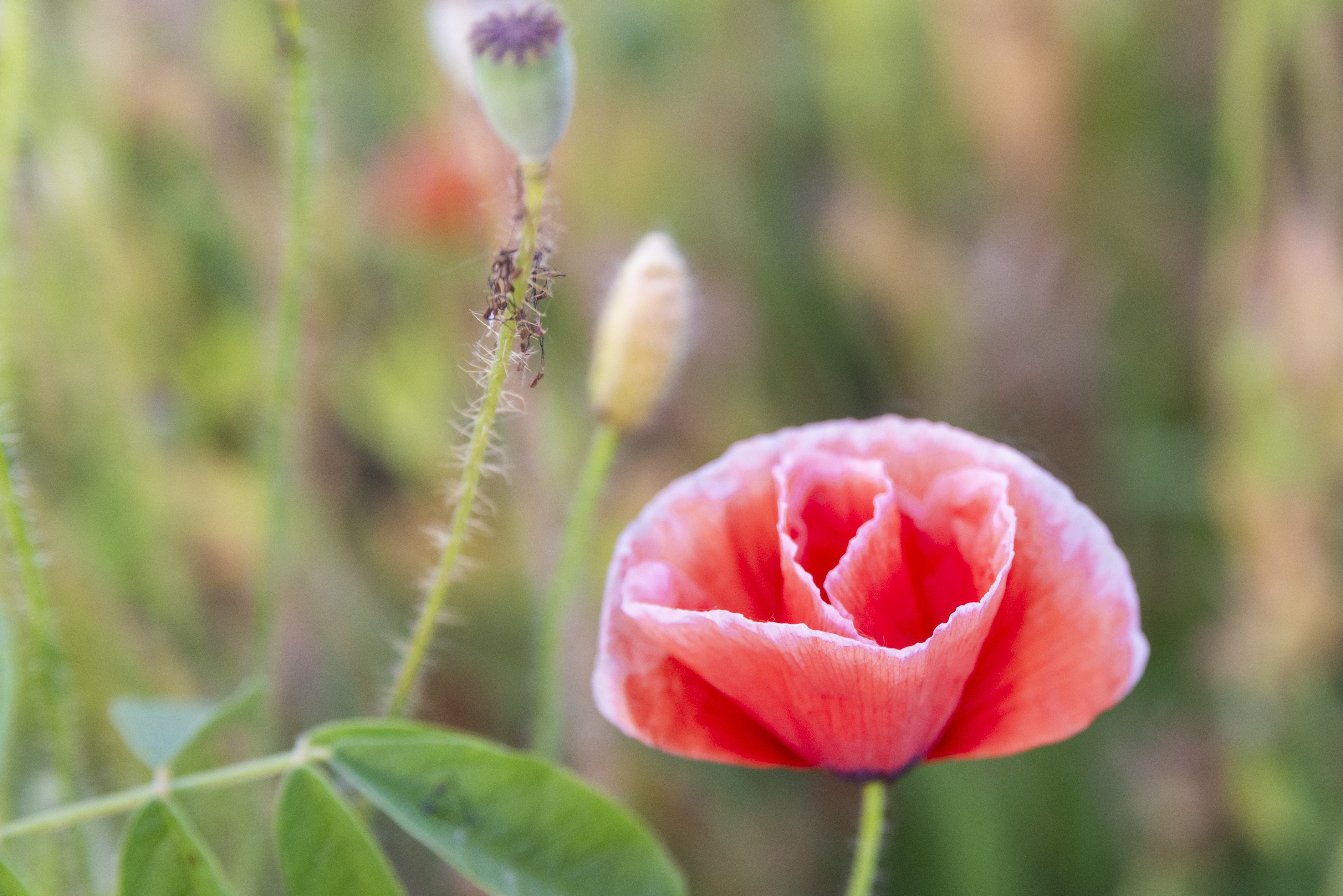 Это завораживающее изображение демонстрирует яркий красный мак в полном раскрытии, расположенный на мягко размытом фоне луга. Фотография сделана во время золотого часа, когда тёплый свет нежно освещает хрупкую текстуру лепестков и создаёт мягкие тени, подчёркивающие их естественные очертания. Вокруг основного объекта расположены зелёные стебли с тонкими волосками и незрелые бутоны, добавляя глубину и повествовательность композиции. Малая глубина резкости создаёт мечтательный эффект боке на заднем плане, привлекая внимание исключительно к насыщенному цветовому градиенту — от нежно-розовых краёв до глубокого красного центра и вельветовой поверхности. Эта сцена вызывает эфирное ощущение, будто зафиксирован момент весеннего обновления на диком цветочном лугу.