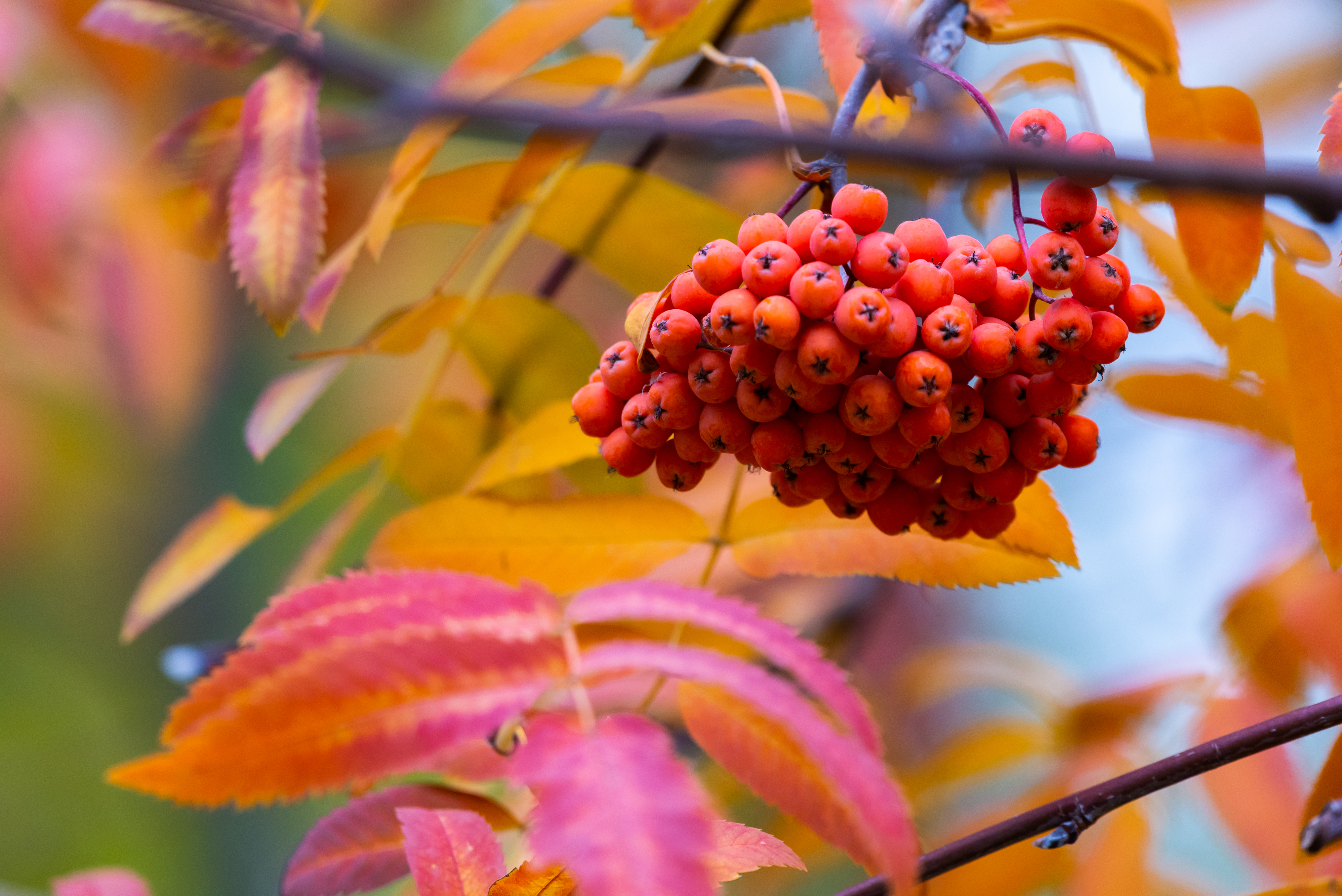 Это привлекательное изображение представляет собой крупный план ярких ягод рябины, свисающих с ветки дерева, окруженных богатыми оттенками осенней листвы. Сцена разворачивается в осеннем парке или лесной местности, где сезонная смена окрашивает всё в тона оранжевого, желтого и розового. Мягкий естественный свет проникает сквозь листья, усиливая насыщенные красные оттенки ягод и создавая мягкие тени на текстурированной коре веток и поверхности листьев. Композиция направляет внимание зрителя к кластеру ягод как главному фокусу, с размытыми фоновыми элементами, которые подчеркивают глубину и создают мечтательную атмосферу.