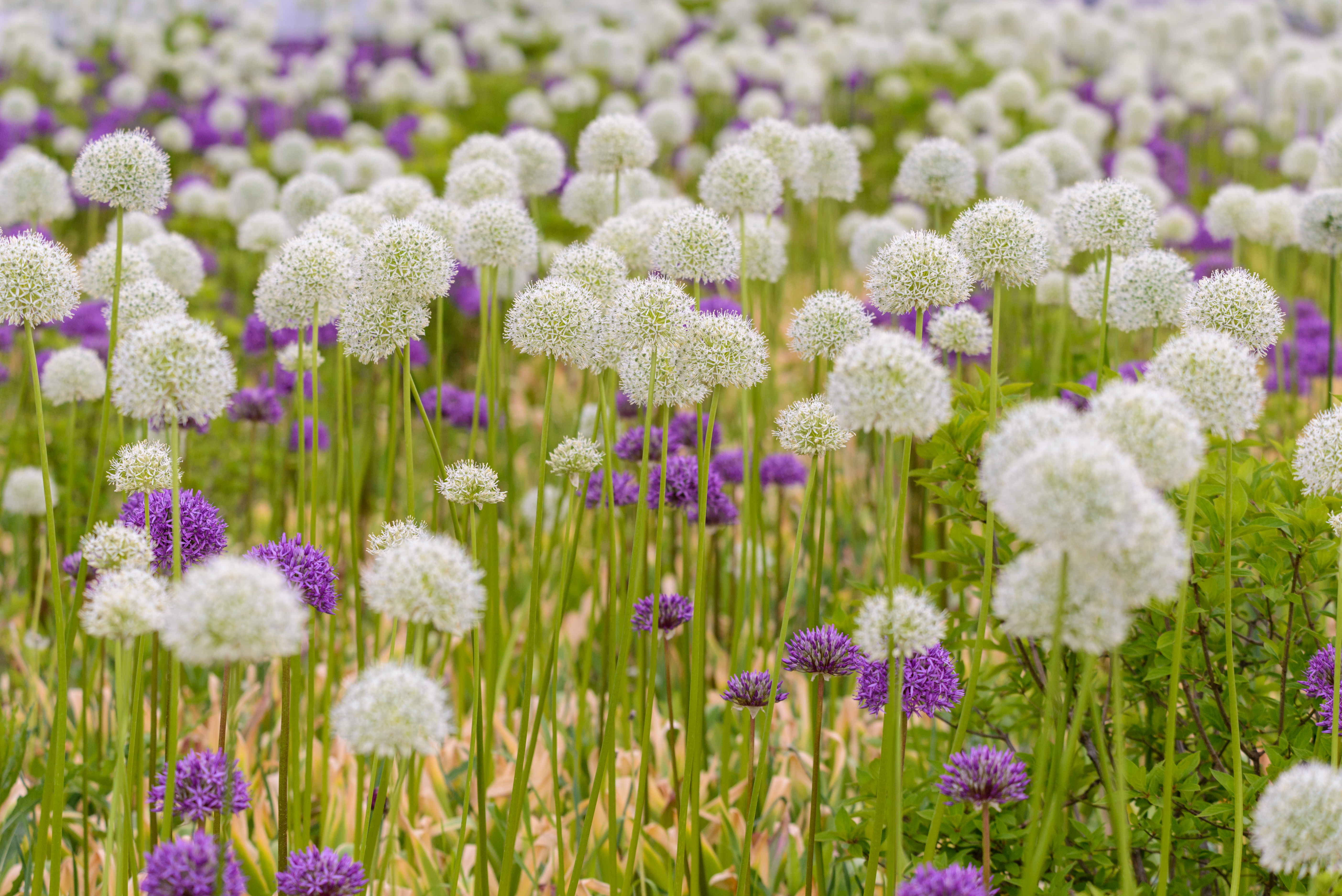 The image captures the majestic blooming Allium giganteum, gracefully standing in a meticulously maintained garden under bright sunlight. This plant, renowned for its large, almost spherical flower heads, adorns the scene with its refined palette — ranging from pure white to delicate violet — evoking a sense of lightness and elegance. The garden in which it grows follows a modern landscape design, featuring neatly trimmed shrubs and smooth pathways that enhance the natural beauty of the flower. The time of capture — early morning or late afternoon — allows sunlight to gently illuminate the blooms, creating warm highlights and soft shadows that imbue the scene with a romantic and tranquil atmosphere. In the distance, trees with lush green foliage provide a natural backdrop, subtly framing the main subject without distracting attention from the allium.