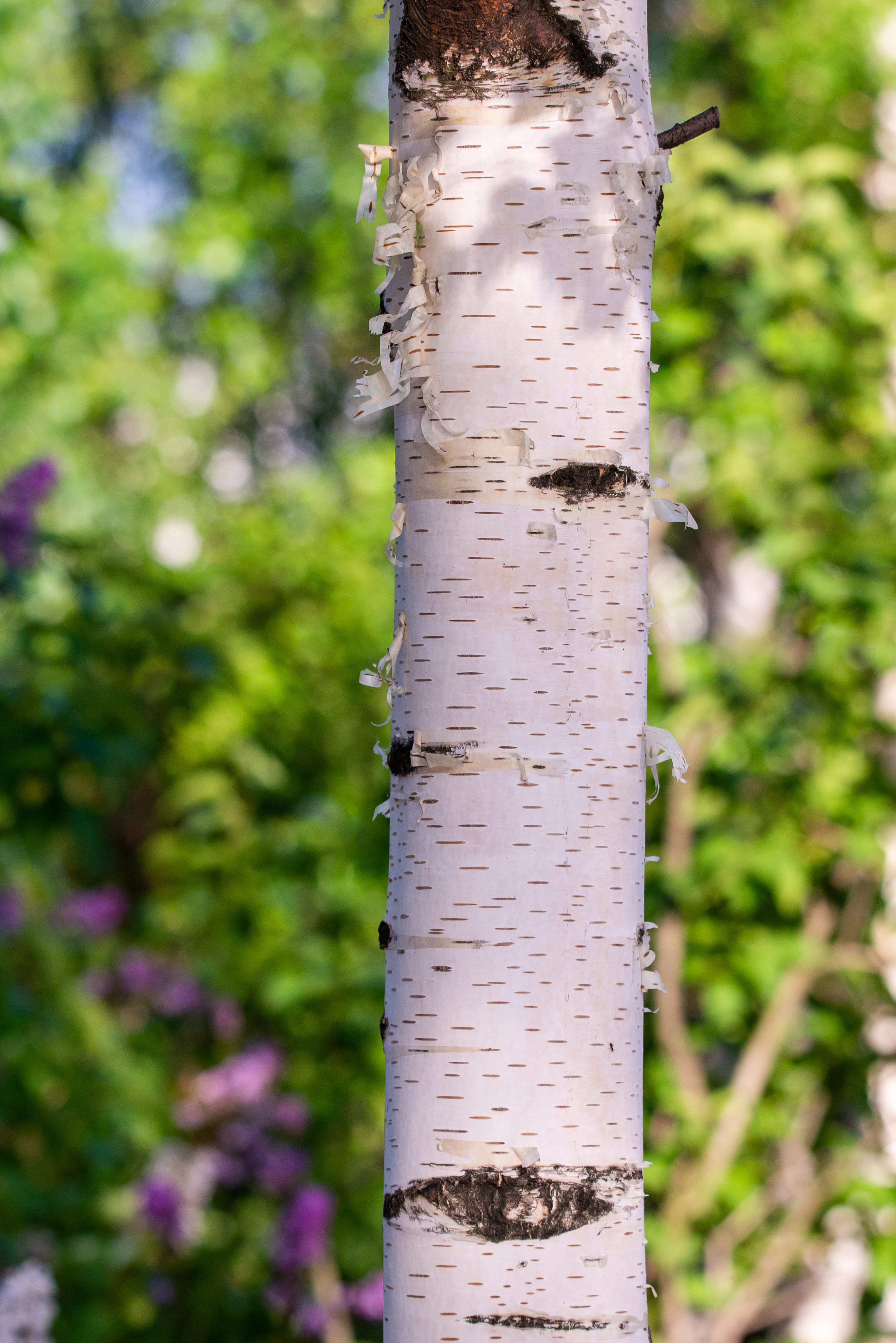 На изображении представлен крупный план ствола белой березы, чья гладкая, почти матовая поверхность выделяется на фоне мягко размытого синего неба, что создает ощущение легкости и воздушности. Сцена, очевидно, снята в весенний период, когда береза только начинает пробуждаться после зимы — ствол еще не покрыт листьями, но уже обладает свежей, живой текстурой, подчеркивающей природную чистоту и нежность. Освещение мягкое, рассеянное, как будто от солнца, скрытого за легкой дымкой, что придает сцене мечтательную, почти фантастическую атмосферу. Глубина резкости минимальна — фокус сосредоточен исключительно на стволе, в то время как фон плавно тонирует в синих тонах, создавая визуальную изоляцию объекта и усиливая его значимость. Композиция строго центрирована, что подчеркивает симметрию и гармонию природного объекта, придавая изображению умиротворяющую структуру.