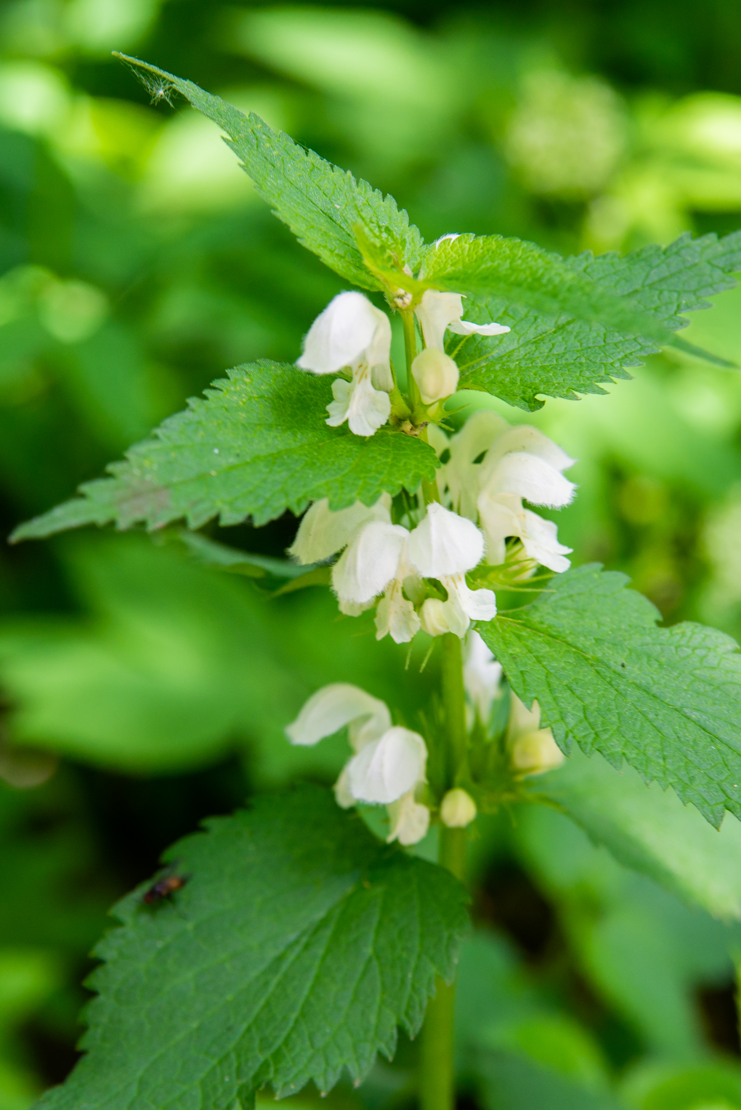 The image captures a serene natural scene where the delicate white flowers of Lamium album, also known as white nettle or white dead-nettle, are in full bloom under gentle sunlight. Shot on a warm summer day, the photograph showcases the peak of the plant’s vitality, surrounded by lush, vibrant greenery. The location appears to be a secluded woodland clearing or meadow, where sunlight filters through the canopy, casting soft shadows and creating a tranquil atmosphere. The air seems crisp and fragrant, evoking a sense of freshness and calm. The composition is balanced, with the central flower emphasized through shallow depth of field, drawing the viewer’s eye while preserving the sense of space and natural context.