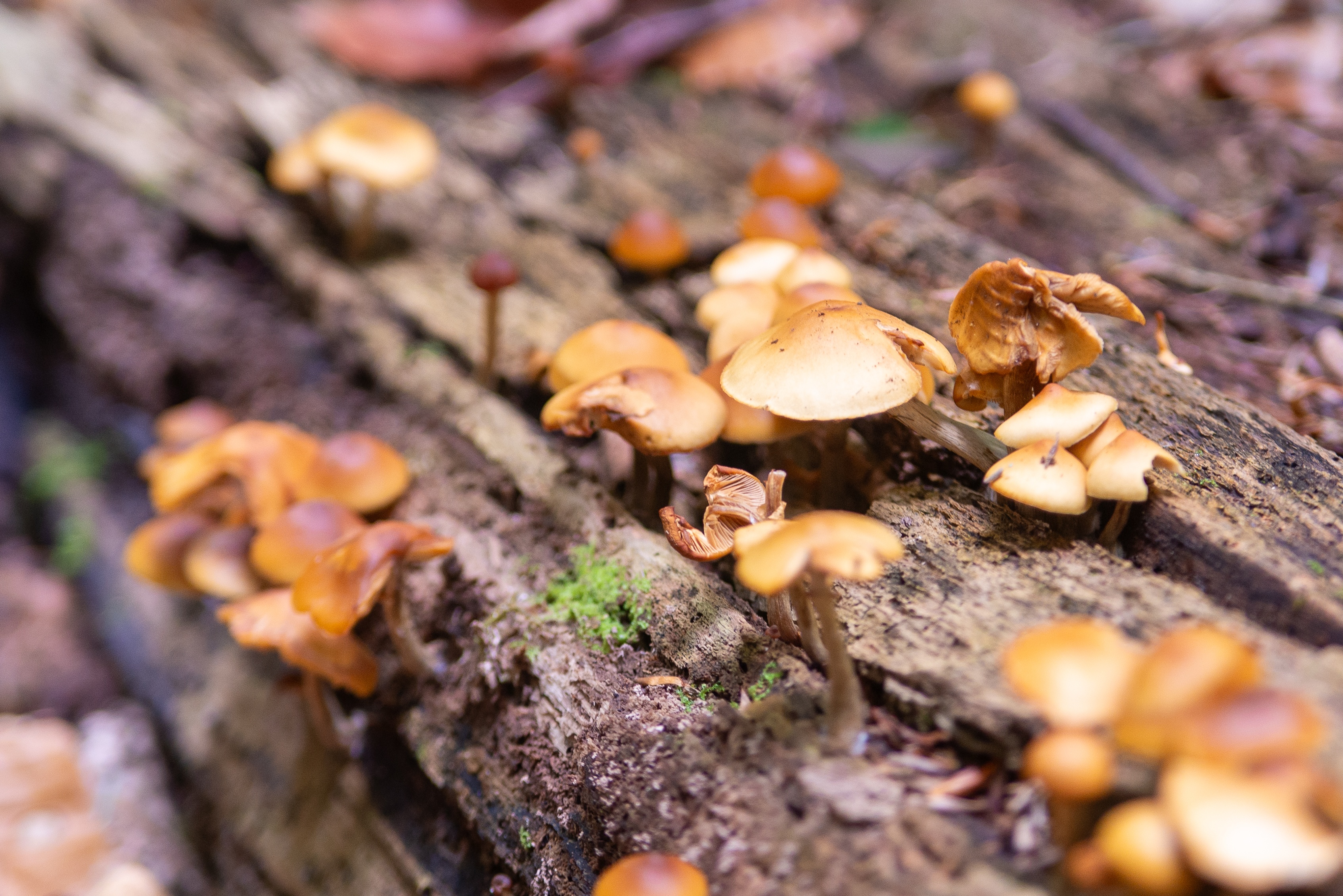 На изображении представлена макросъемка живописного лесного уголка в Адыгее, где на поверхности поваленного дерева растут множественные дикие грибы. Сцена происходит в тенистом, влажном лесу, где мягкий рассеянный свет проникает сквозь кроны деревьев, создавая атмосферу умиротворения и близости к природе. Вокруг грибов видны зеленые пятна мха и опавшие коричневые листья, что подчеркивает сезонность и естественность места. Композиция сфокусирована на грибах, которые выглядят как маленькие, но живые существа, пробуждающиеся из древесины, словно природное явление, которое происходит ежедневно, но остается незамеченным для большинства. Время съемки, скорее всего, раннее утро или поздний вечер, когда свет мягкий и теплый, что усиливает ощущение спокойствия и уюта.