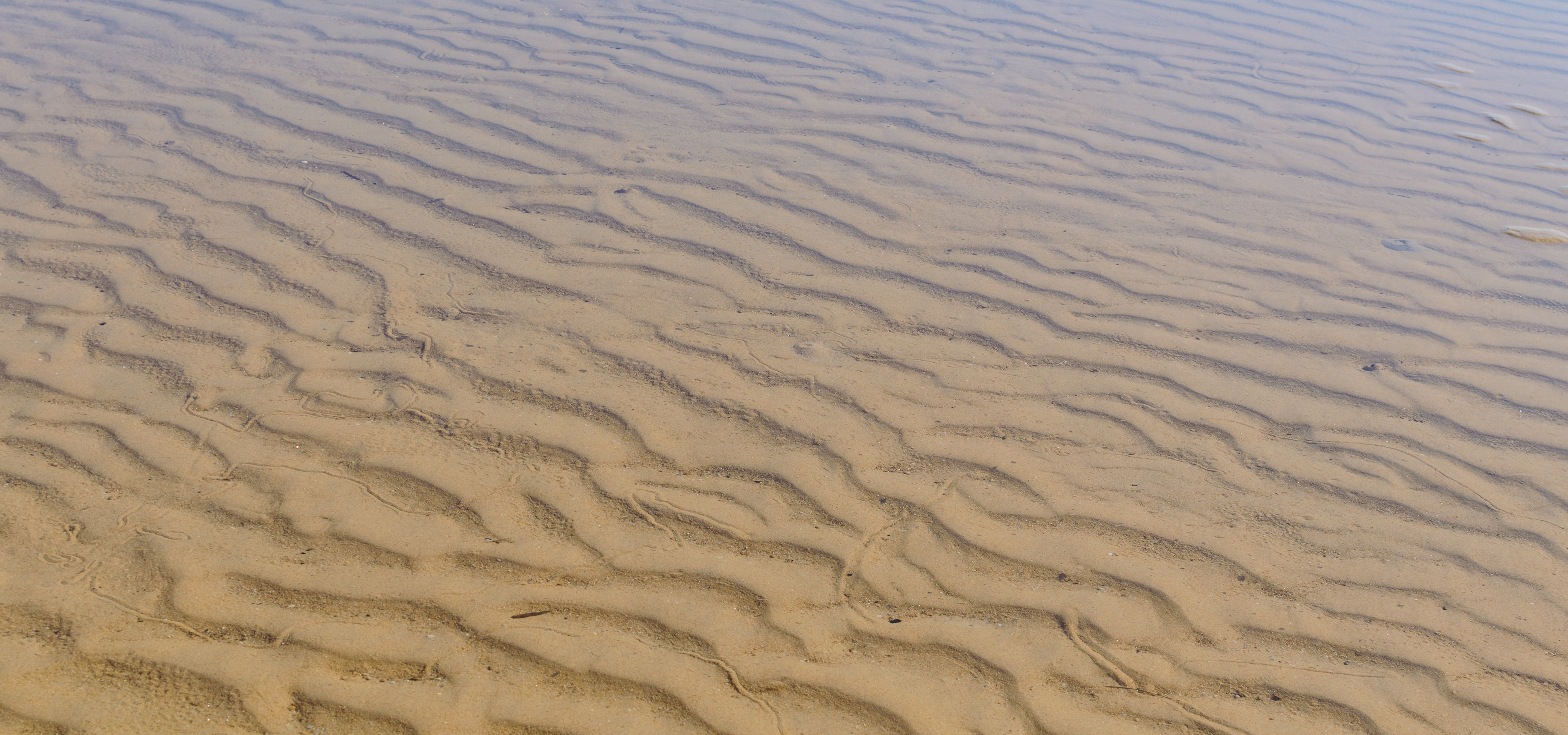 Это захватывающее крупное фото раскрывает сложную, естественно сформированную структуру мокрого песка на морском берегу. Изображение запечатлело тонкие волны, оставленные отступающими волнами, которые создают изящные, плавные линии, напоминающие абстрактное искусство или природную скульптуру. Сцена происходит под мягким дневным светом, вероятно, утром или вечером, когда солнечный свет отбрасывает тёплый золотистый отблеск по поверхности, усиливая насыщенные бежевые и светло-коричневые тона песка. Свет мягко отражается от мелководной воды, покрывающей часть берега, создавая нежные мерцающие эффекты, добавляющие глубину композиции.