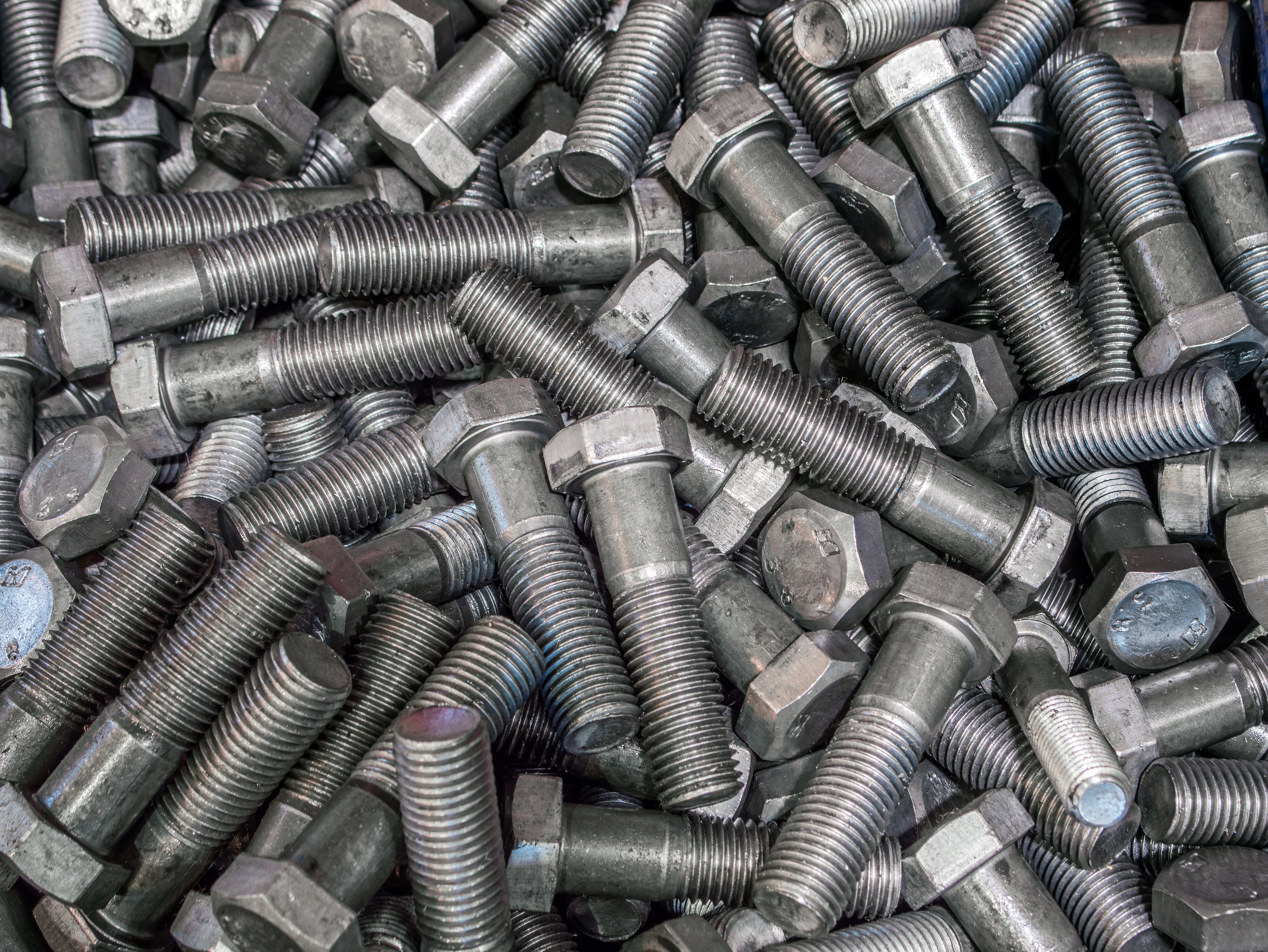 На снимке представлено плотное скопление металлических болтов с шестигранной головкой, расположенных в хаотичной, но визуально упорядоченной композиции. Каждый болт выглядит как миниатюрный инструмент инженерии, его поверхность покрыта следами механической обработки и легким отблеском металла, что придает сцене ощущение промышленной точности и надежности. Фотография сделана в условиях студийного освещения, где мягкие боковые лучи подчеркивают рельефные грани шестигранников и тонкие ребра резьбы, создавая игру света и тени, которая придает объектам объем и глубину. Видимая текстура — от грубой шероховатости резьбы до гладкого, полированного металла головок — позволяет зрителю ощутить материал на ощупь, словно он может прикоснуться к ним. Снимок не просто документирует предметы, он погружает в мир технической эстетики, где каждая деталь важна, а каждая форма — результат человеческого труда и инженерного мышления.