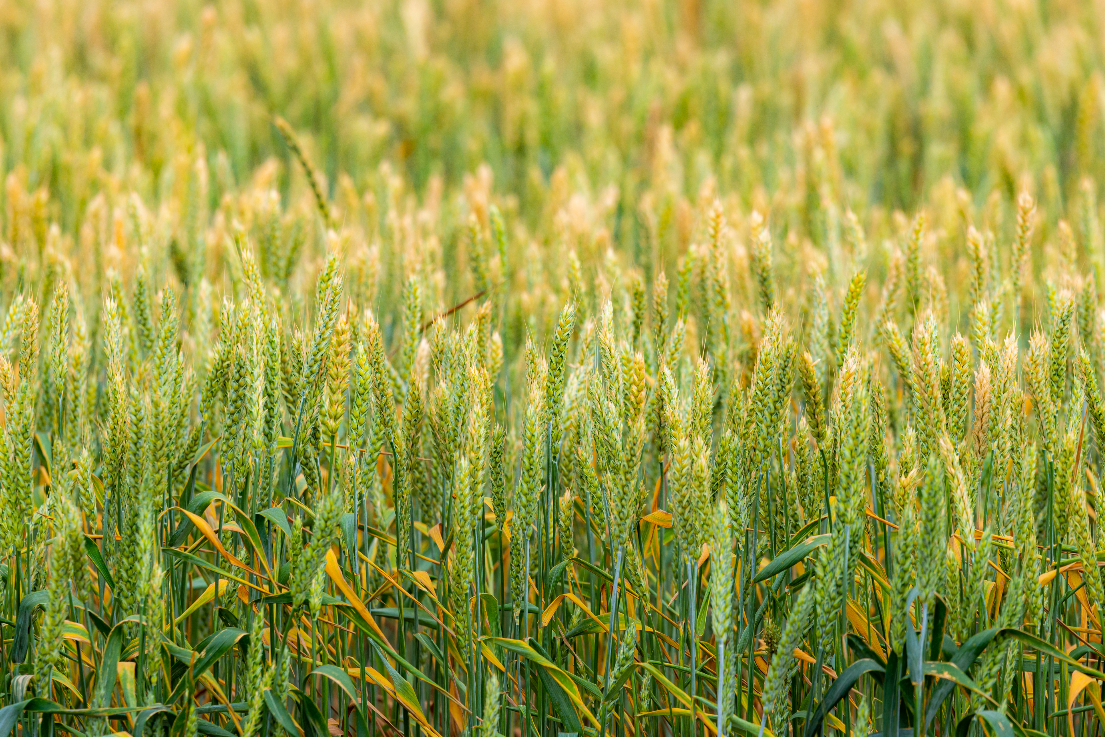 The composition is strictly horizontal, emphasizing the calm and peacefulness of the scene. Each wheat stalk, like a delicate thread, stands out against the sky, creating a rhythmic texture that guides the viewer’s gaze into the depth of the frame. The color palette blends rich greens—from bright to deeper shades—gradually transitioning into golden-yellow highlights at the tips of the stalks. The lighting is soft and diffused, allowing for detailed observation of leaf textures, their delicate surfaces, and perhaps even a faint dewy sheen from morning moisture or light mist. The soil, though not fully visible, is implied as dark brown, providing a subtle contrast to the vividness of the vegetation. All elements—from depth of field to camera angle—are carefully arranged to create a sense of volume and space, while maintaining naturalness and realism.