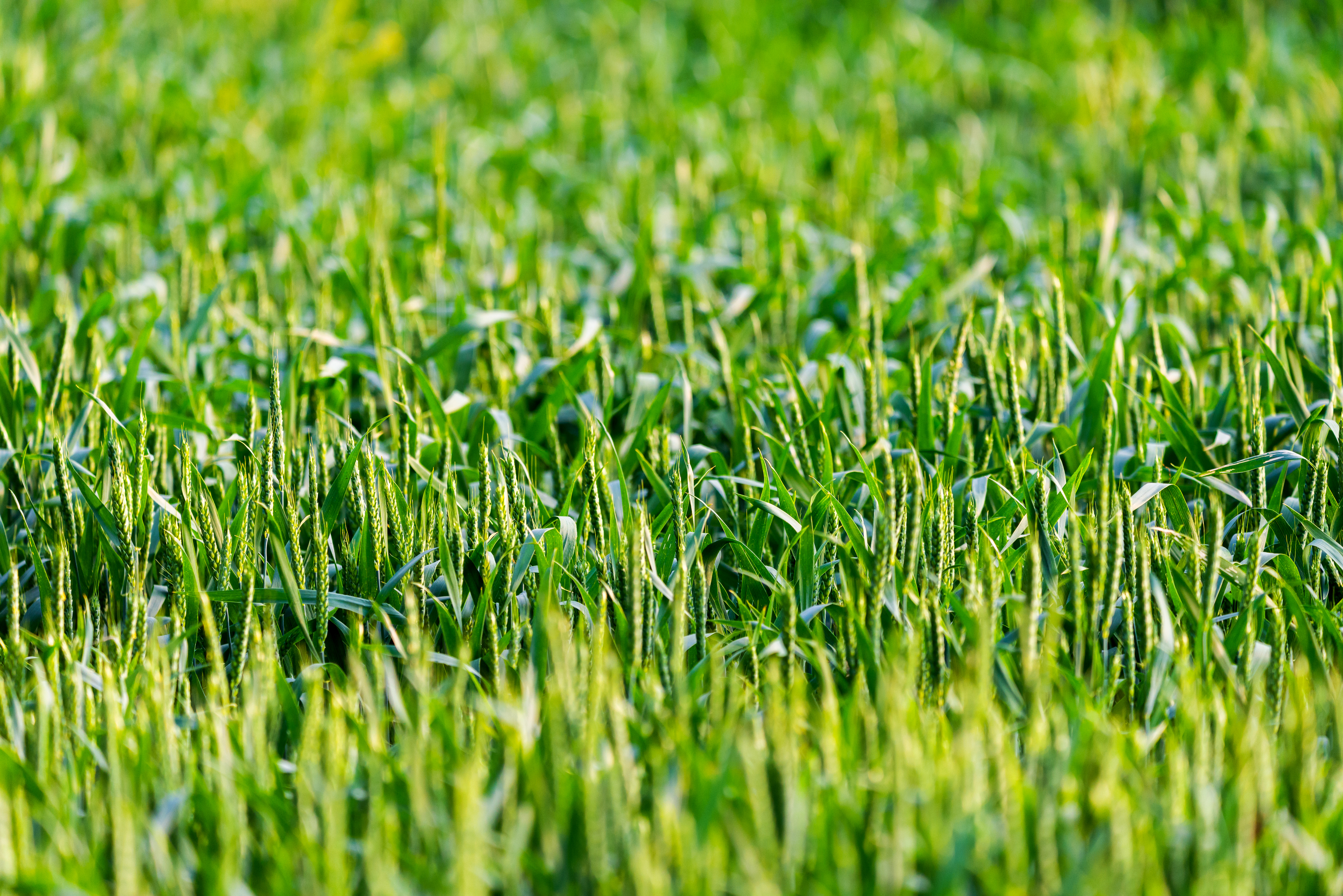 Композиция построена с учетом природной симметрии и ритма: пшеница растет в плотных рядах, образуя естественные волны, которые ведут взгляд зрителя вглубь кадра. Цветовая палитра состоит преимущественно из оттенков свежего зеленого — от бирюзового до насыщенного изумрудного — с добавлением теплых желтых и кремовых тонов на стеблях и листьях. Освещение мягкое, рассеянное, с минимальными тенями, что подчеркивает текстуру листьев и гладкость стеблей. Материалы растений выглядят естественными: кожистые листья, хрупкие стебли, слегка шелковистая поверхность колосков. Кадр снят с низкой точки, что позволяет зрителю ощущать себя частью поля, а не наблюдателем с высоты.