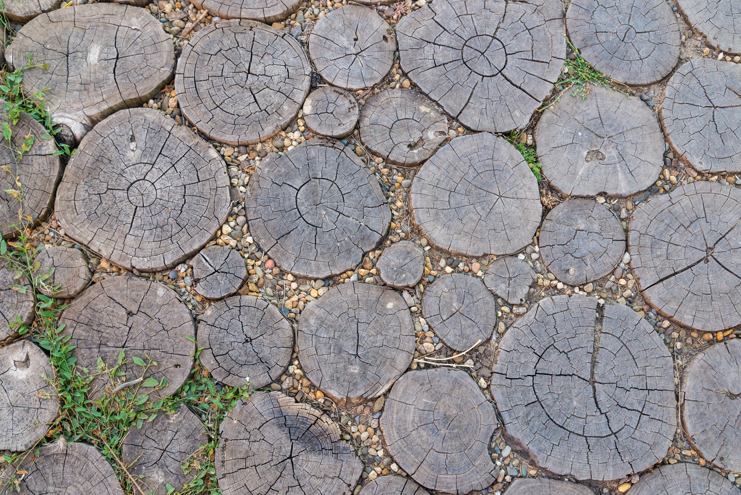 The image captures a serene garden pathway composed of large, round wooden logs arranged in a rhythmic, organic pattern that invites the viewer to walk along and immerse themselves in a tranquil, natural setting. The logs create a visually engaging composition that leads the eye into the depth of the scene, surrounded by lush green grass that grows between and around them, contrasting the rough texture of wood with the softness of vegetation. The top-down perspective allows for a comprehensive view of the path’s geometry, its natural curvature, and how it integrates into the surrounding space. The background features rustic elements — blurred outlines of trees, shrubs, and possibly an old fence — enhancing the sense of rural charm and comfort. The lighting is soft and diffused, as if sunlight filters through clouds, gently highlighting the grain of the wood and the delicate blades of grass, adding warmth and coziness. The color palette consists of muted browns, greens, and earth tones, evoking a sense of calm and harmony with nature.