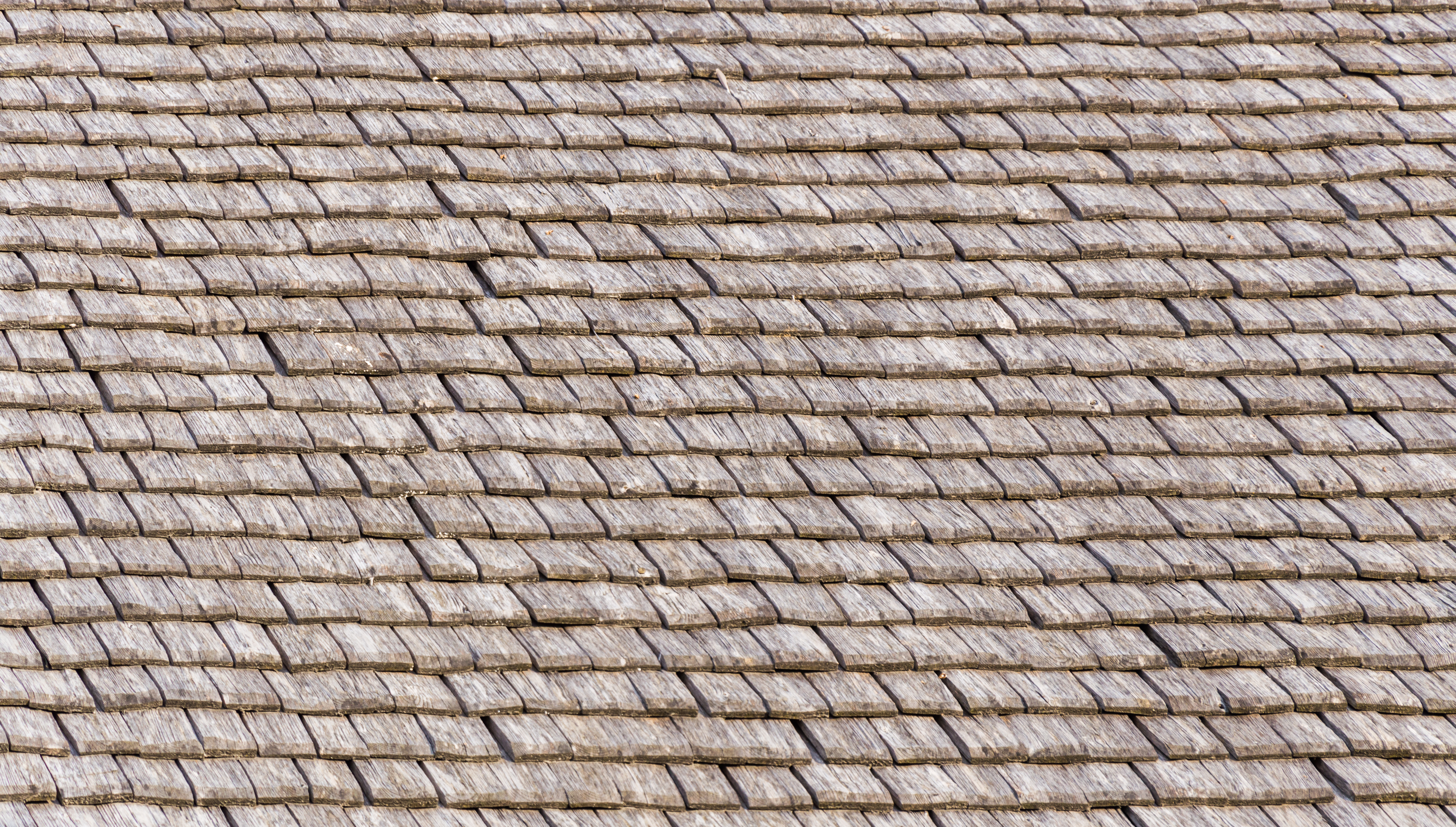 На изображении представлено старое деревянное покрытие крыши, выполненное из толстых, изношенных досок, которые слегка наклонены друг к другу, создавая естественный уклон, характерный для ручной укладки. Дерево обладает теплой, насыщенной текстурой, с заметными следами времени — трещинами, потертостями и естественным патинированием, которое придает ему историческую глубину. Каждая доска уникальна по форме и цвету, от светло-коричневого до темно-оливкового, что создает богатую палитру и визуальную динамику. Сцена, вероятно, снимается в мягком рассеянном свете, возможно, в пасмурный день, что позволяет подчеркнуть фактуру древесины и мягко моделировать ее рельеф. Видимая перспектива подчеркивает глубину кадра, как будто зритель смотрит вдоль ряда досок, уходящих вдаль, создавая ощущение пространства и объема. Эта композиция идеально подходит для фоновых изображений, где требуется атмосфера уюта, ретро-стиля или сельской простоты, а также для дизайнеров, ищущих органические текстуры для веб-дизайна, печати или декоративных проектов.