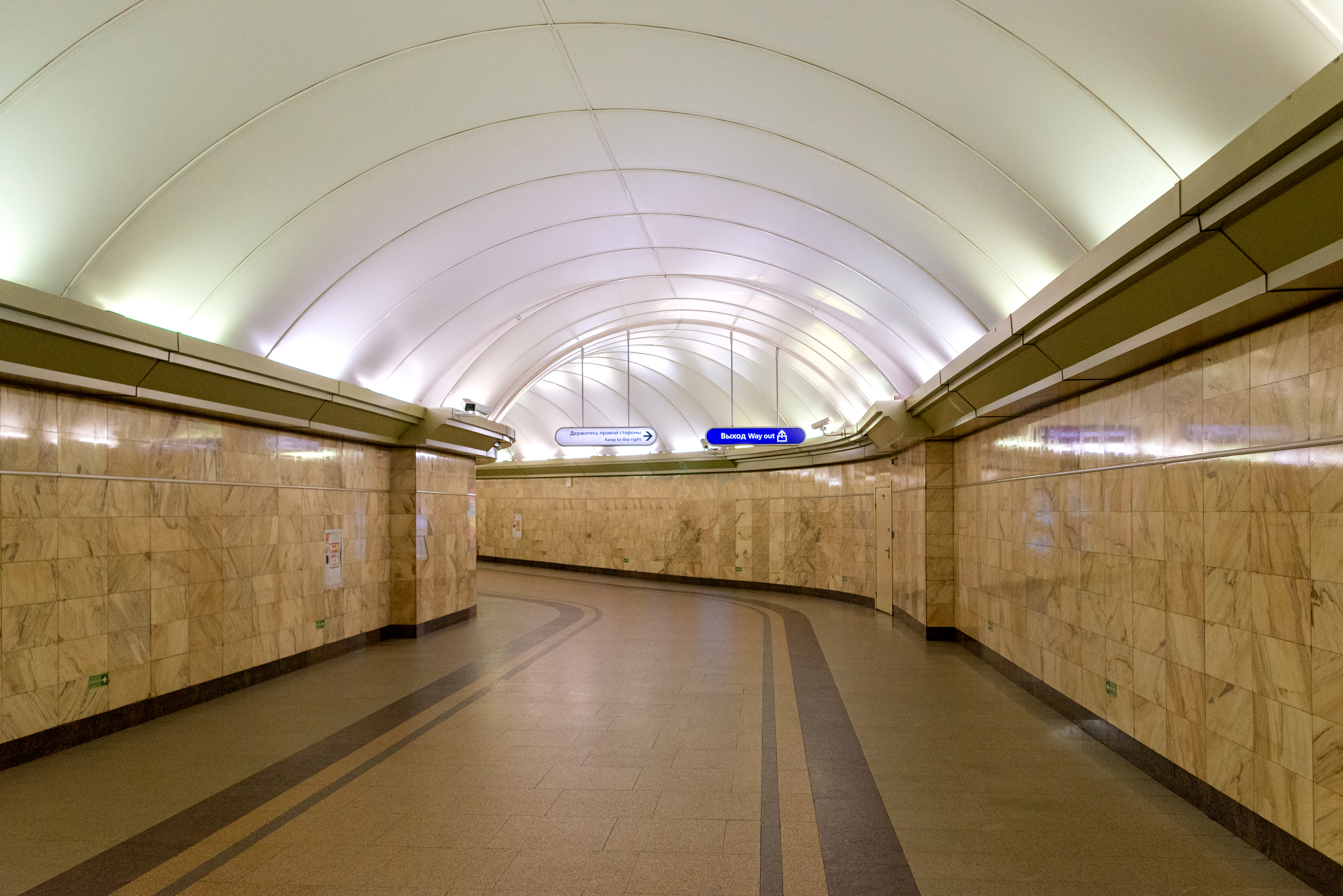 Это изображение запечатлевает величественный и спокойный интерьер подземного перехода метрополитена. Центральное место занимает сводчатый потолок, плавно изгибающийся и создающий ощущение простора и монументальности. Белый цвет потолка, освещенный встроенными светильниками, придает пространству воздушность и чистоту, отражая свет и визуально расширяя его.