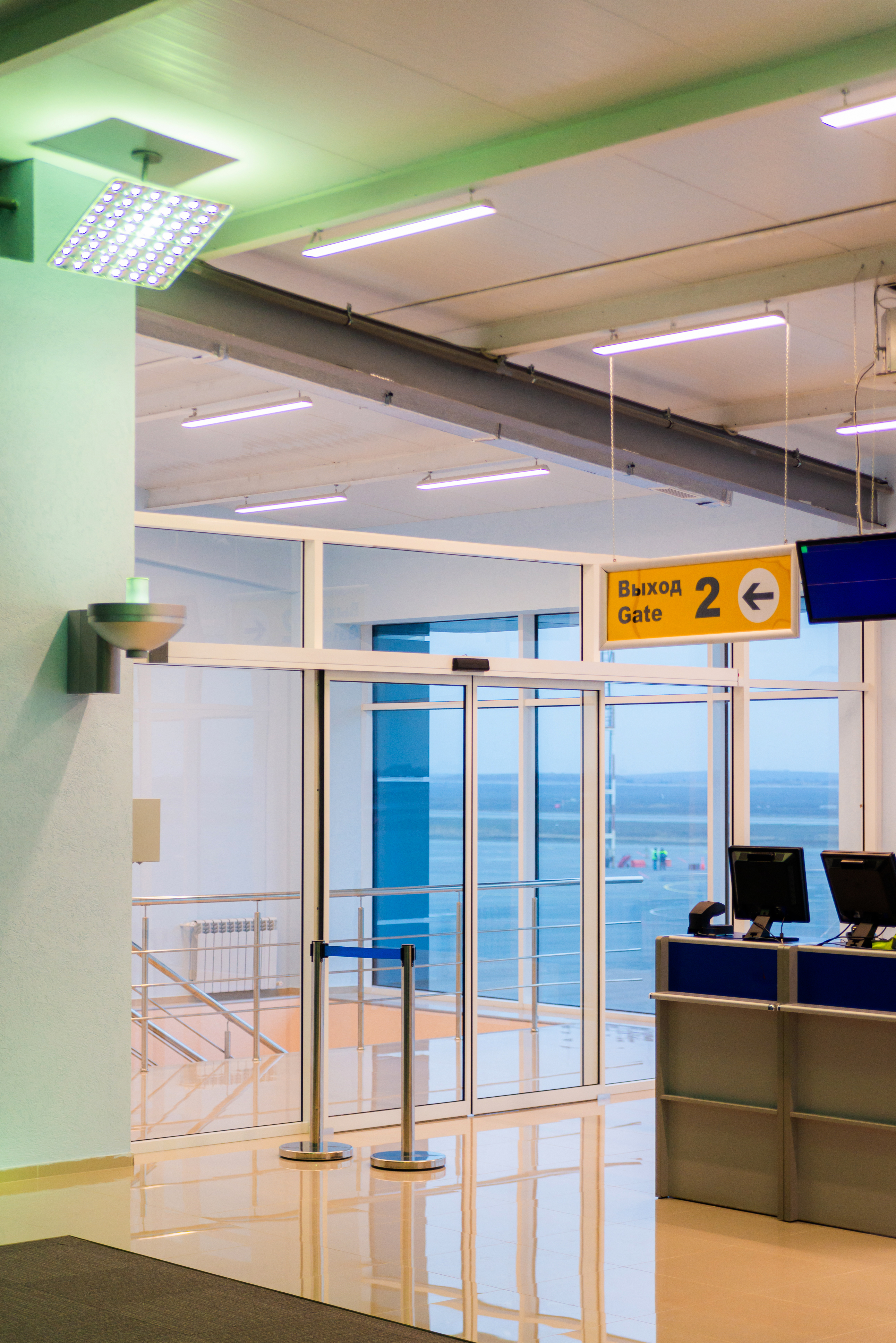 Центральное место занимает группа автоматических стеклянных дверей, ведущих к выходу №2. Яркая желтая табличка с надписью «Выход 2» и стрелкой четко указывает направление, облегчая навигацию для пассажиров.