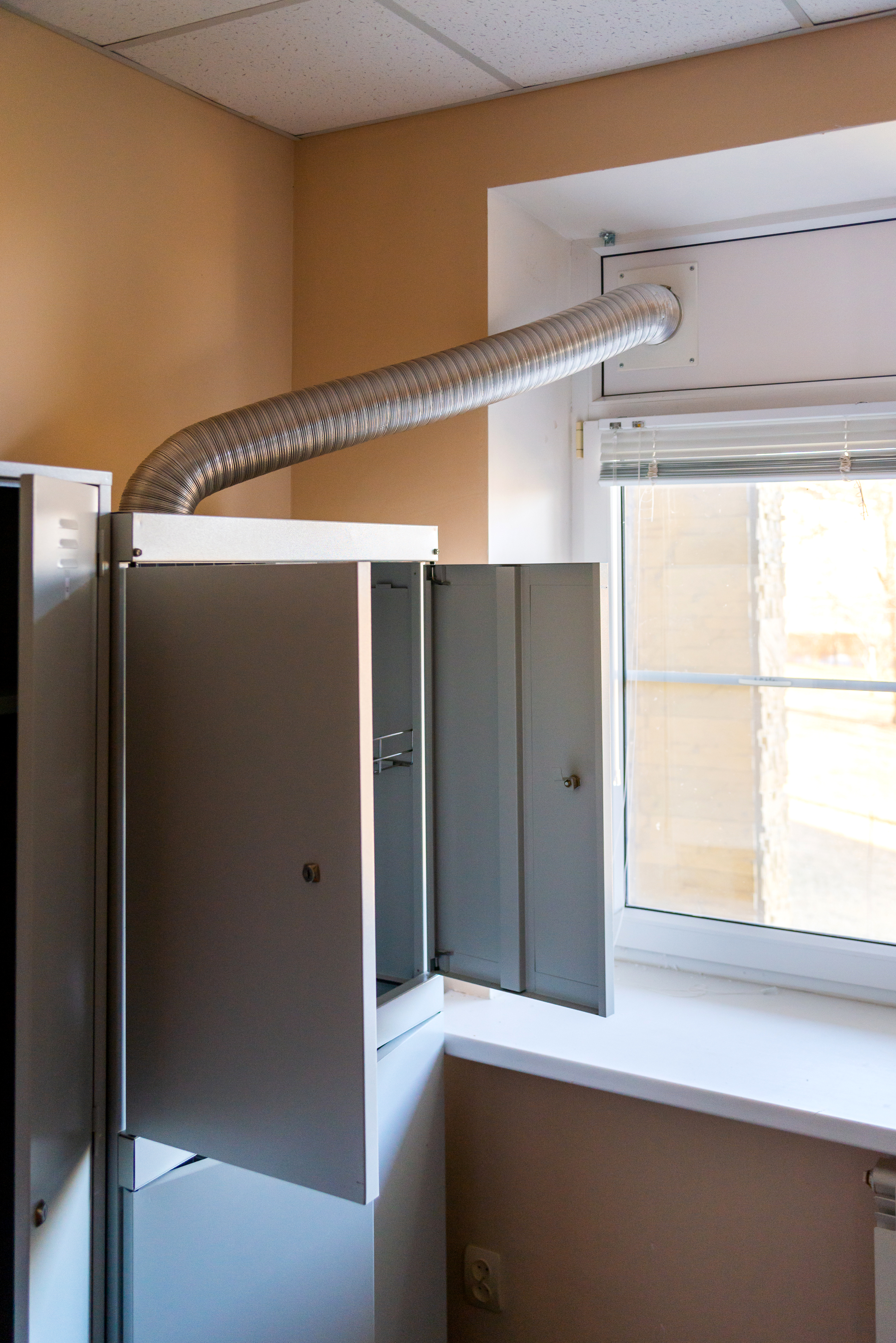 This image captures an unusual interior detail where functionality meets an unconventional solution. In the frame, we see a part of a metal locker, with one door left open, revealing its internal storage space. Above the locker, from its top part, emerges a flexible, corrugated silver ventilation pipe. This pipe, like a snake, curves and heads towards the window, where it is fixed in the opening, likely for air exhaust or circulation.
