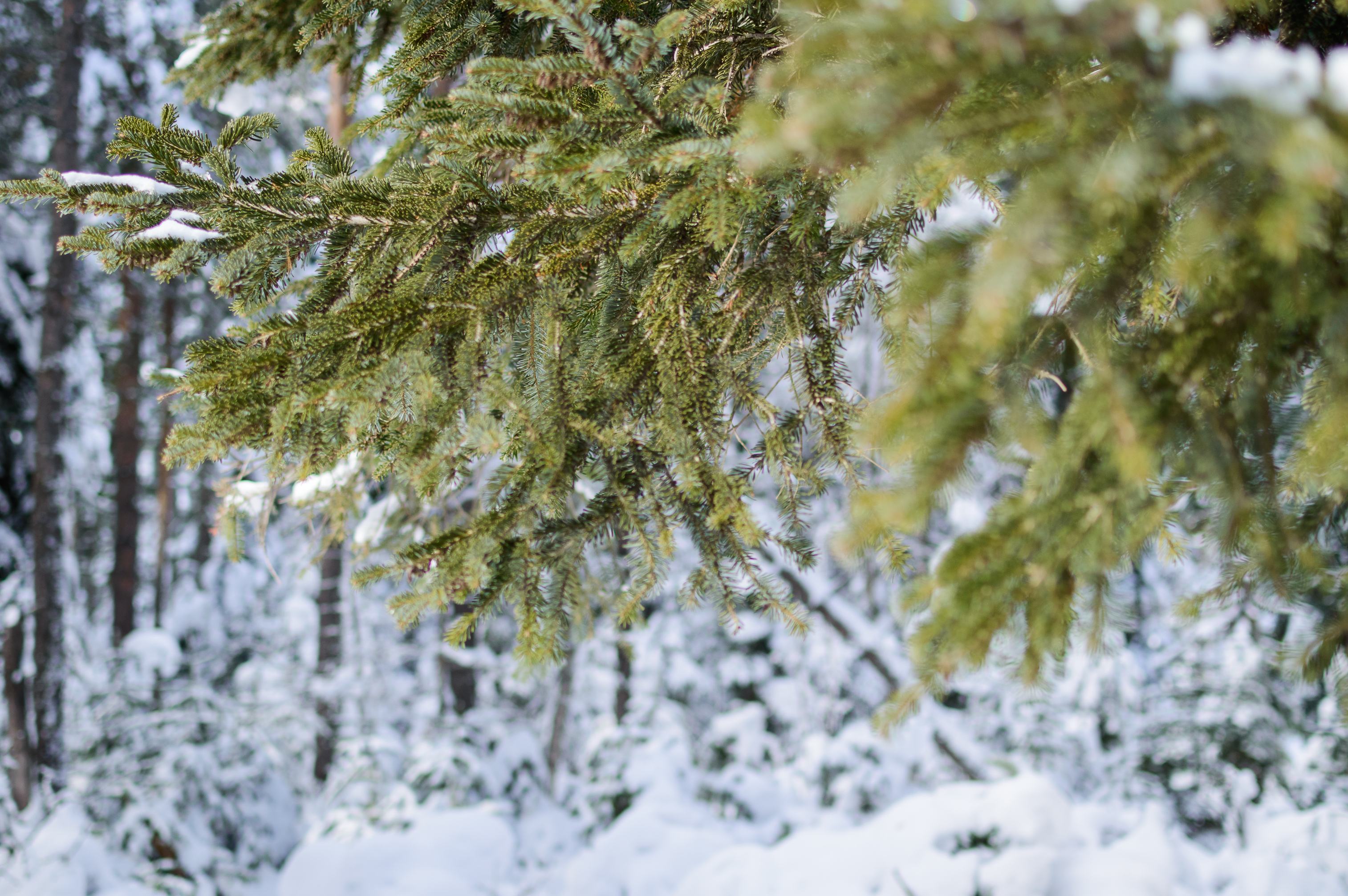За ветвями ели открывается живописный вид на лесную глубь. Деревья стоят, укрытые снежным покровом, создавая ощущение умиротворения и покоя. Размытый фон подчеркивает глубину кадра и фокусирует внимание на текстуре и деталях переднего плана. Цветовая палитра изображения построена на контрасте глубокой зелени хвои и белоснежных оттенков снега, с вкраплениями серых и коричневых тонов стволов деревьев вдалеке.