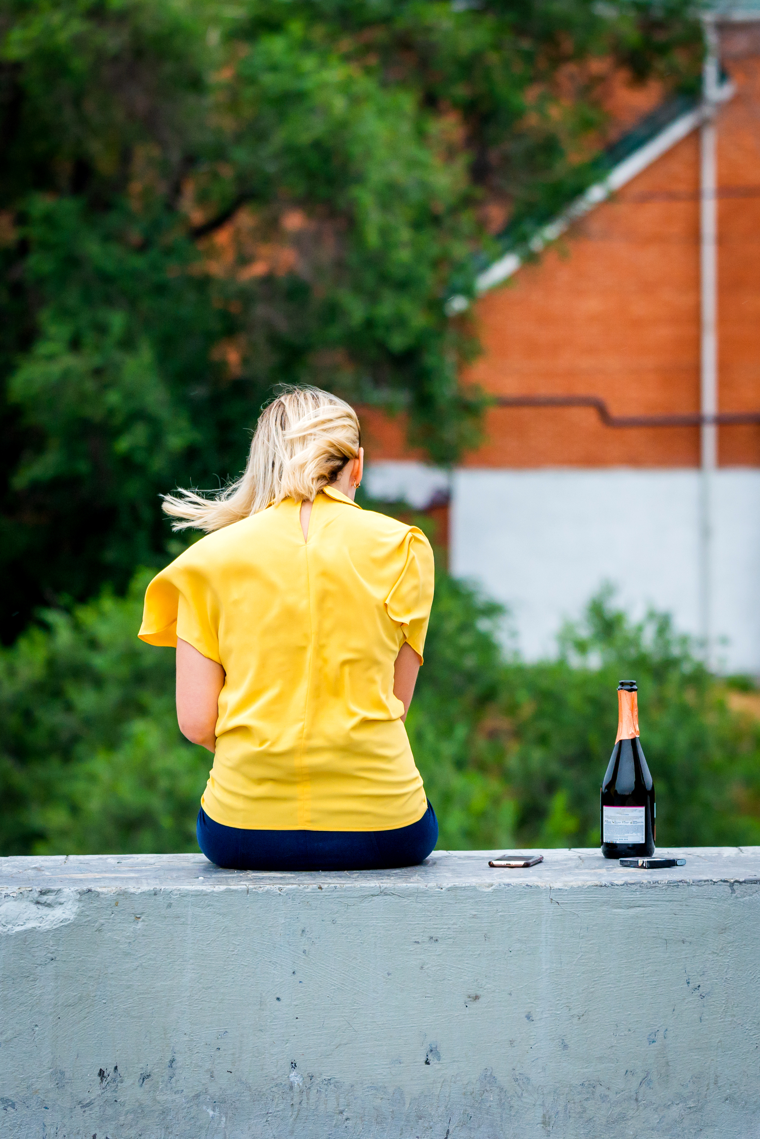 Композиция снимка выстроена таким образом, что фокус внимания смещен на одинокую фигуру девушки, контрастирующую с природным и архитектурным окружением. Цветовая палитра изображения гармонично сочетает теплый солнечный оттенок блузки с прохладными тонами зелени и нейтральным серым цветом стены. Присутствие бутылки вина и двух мобильных телефонов рядом с девушкой намекает на возможный сценарий: она либо ожидает кого-то, либо наслаждается моментом спокойствия и отдыха, возможно, перед или после какого-то события.