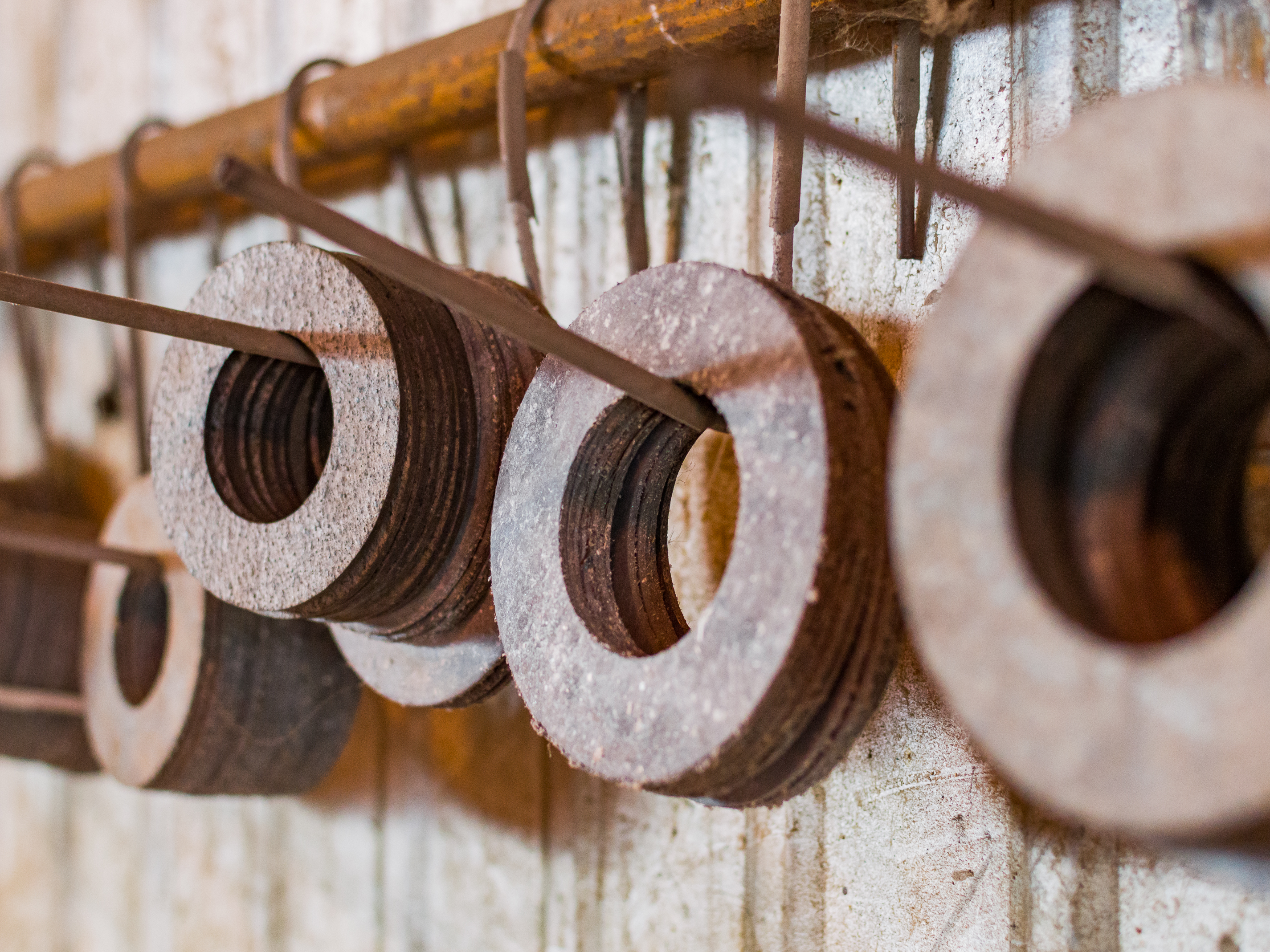 Каждая шайба имеет характерное кольцевое отверстие в центре, через которое продет тонкий металлический прут, удерживающий их вместе. Поверхность шайб шероховатая, с видимыми следами износа, что придает им аутентичный, винтажный вид. Цветовая палитра снимка состоит преимущественно из теплых, землистых оттенков: коричневого, серого и охры, с легкими бликами света, подчеркивающими рельеф и текстуру материалов.