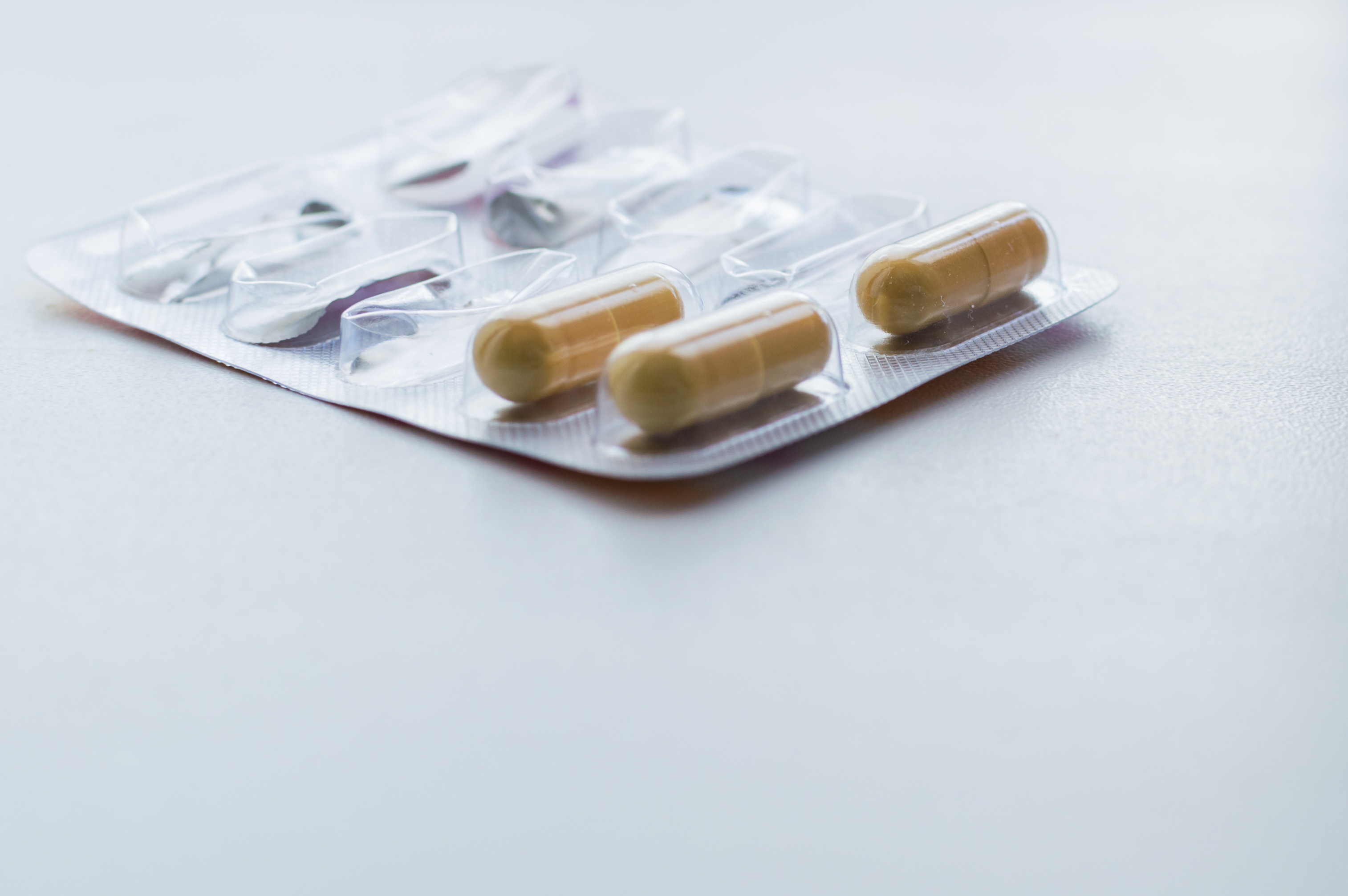 Изображение представляет собой минималистичный крупный план блистерной упаковки с лекарственными препаратами. В центре композиции находится полупустой блистер, где видны несколько желто-коричневых капсул. Одна капсула расположена ближе всего к зрителю, ее гладкая, глянцевая поверхность отражает мягкий свет, подчеркивая ее цилиндрическую форму. Рядом с ней находятся еще две капсулы, их полупрозрачная оболочка придает им легкий, воздушный вид.