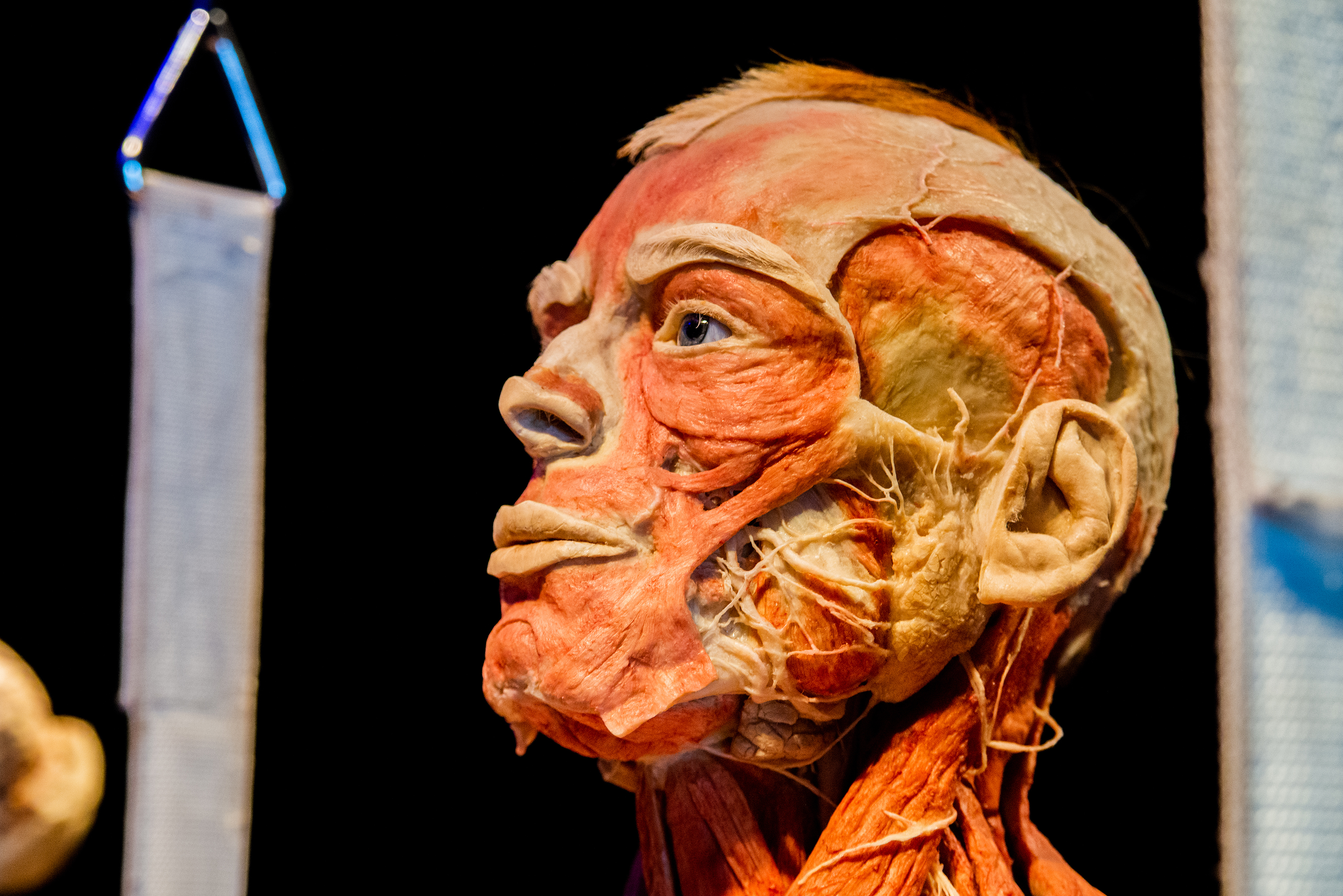 Композиция кадра построена таким образом, чтобы акцентировать внимание на лицевой части препарата. Фон полностью черный, что максимально выделяет текстуру и объем анатомических структур, лишая их контекста и подчеркивая их научную ценность. Слева от экспоната виднеется часть инсталляции, возможно, информационного стенда или другого элемента выставки, освещенного холодным синим светом, который создает футуристический, научно-популярный антураж. Цветовая палитра изображения доминируют теплые оттенки красного, розового и желтого, присущие мышечной ткани, контрастируя с холодными синими всполохами на заднем плане. Освещение направленное, подчеркивающее рельеф и детализацию препарата, создавая игру света и тени, которая добавляет снимку драматизма.