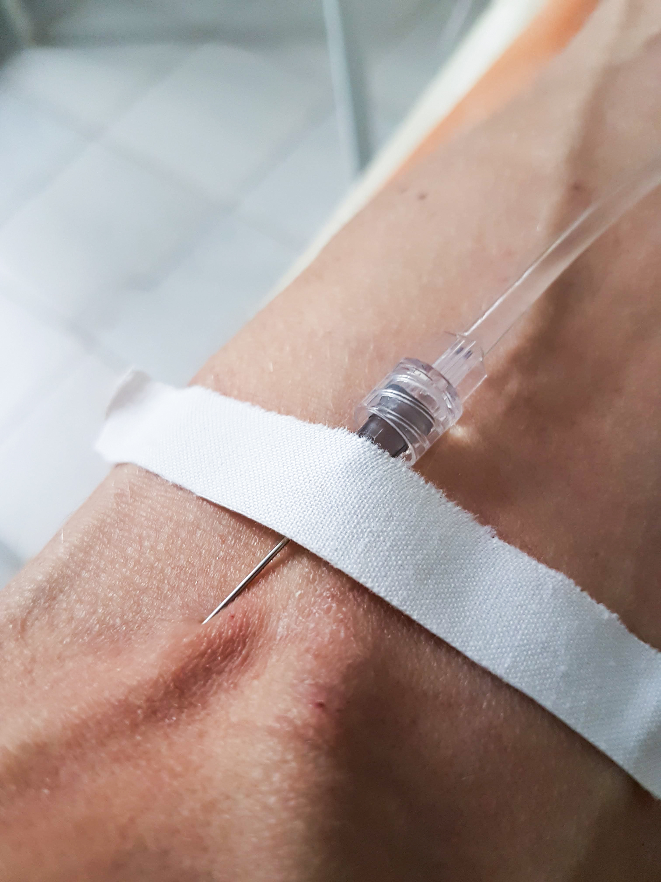 This close-up photograph showcases a medical IV needle precisely inserted into a human vein. The image was captured within a hospital room, evidenced by the blurred background that hints at a sterile medical facility. A white fabric tourniquet, applied above the injection site, aids in better vein distension, facilitating the needle insertion process.