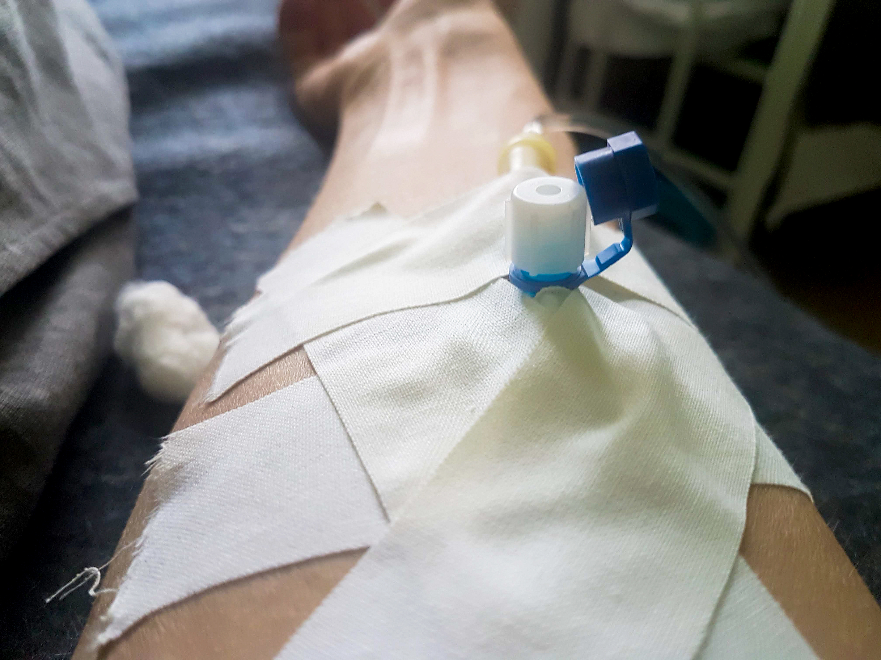 This image captures a close-up view of a medical procedure - the insertion of a peripheral venous catheter into a human arm vein. The shot was likely taken in a hospital setting, possibly in a ward or treatment room. Soft, diffused lighting, typical of indoor environments, creates a calm and slightly subdued atmosphere, suggesting a possible time of day – morning or evening when natural light is less intense, or perhaps overcast weather outside.