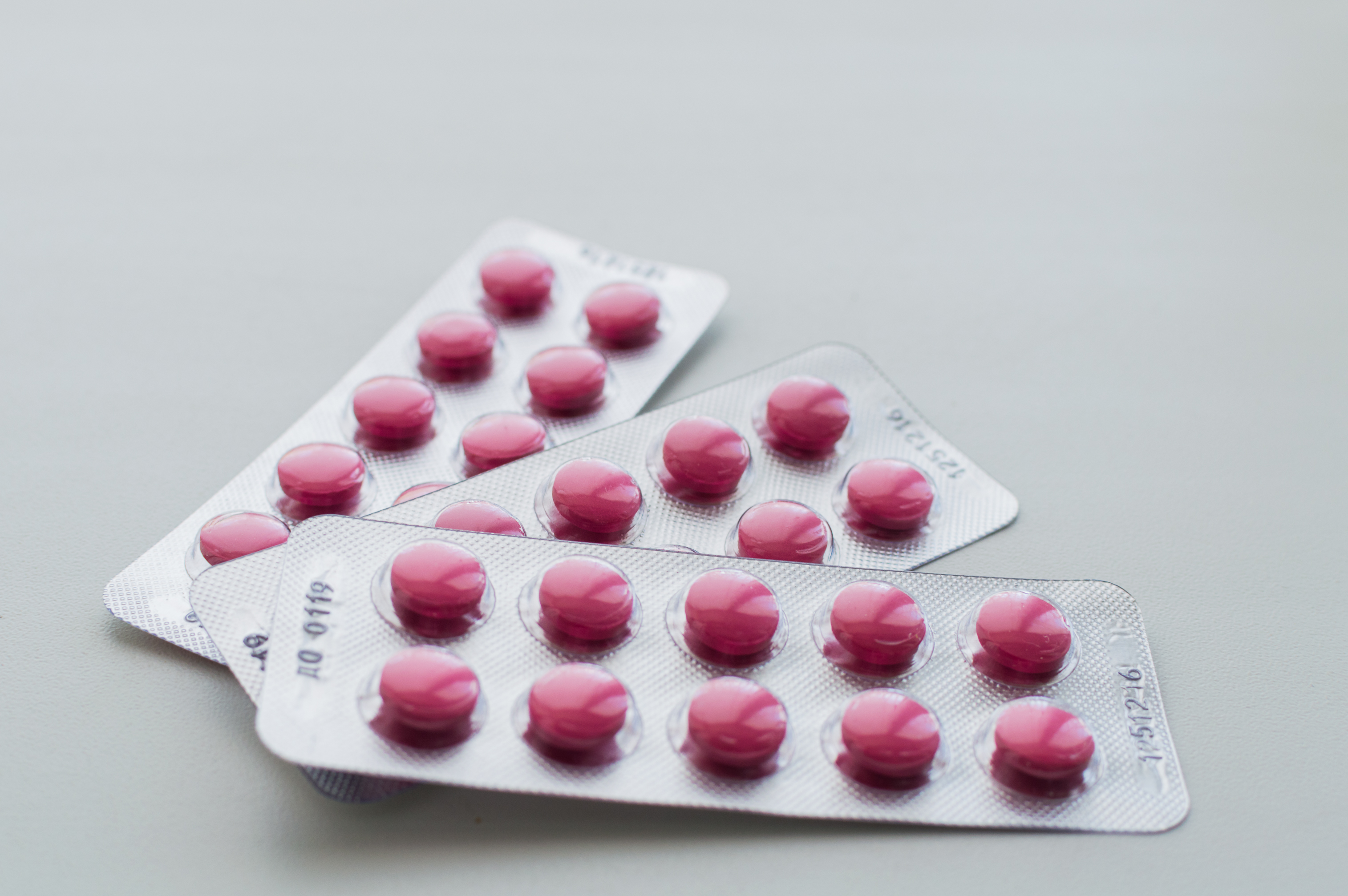 Таблетки имеют округлую форму и глянцевую поверхность, отражающую свет, что придает им вид гладких, отполированных драже. Их насыщенный розовый цвет контрастирует с холодным, приглушенным фоном, делая основной объект съемки выразительным и привлекающим внимание. Фокус изображения сосредоточен на таблетках и упаковках, в то время как фон размыт, что подчеркивает детали медикаментов.