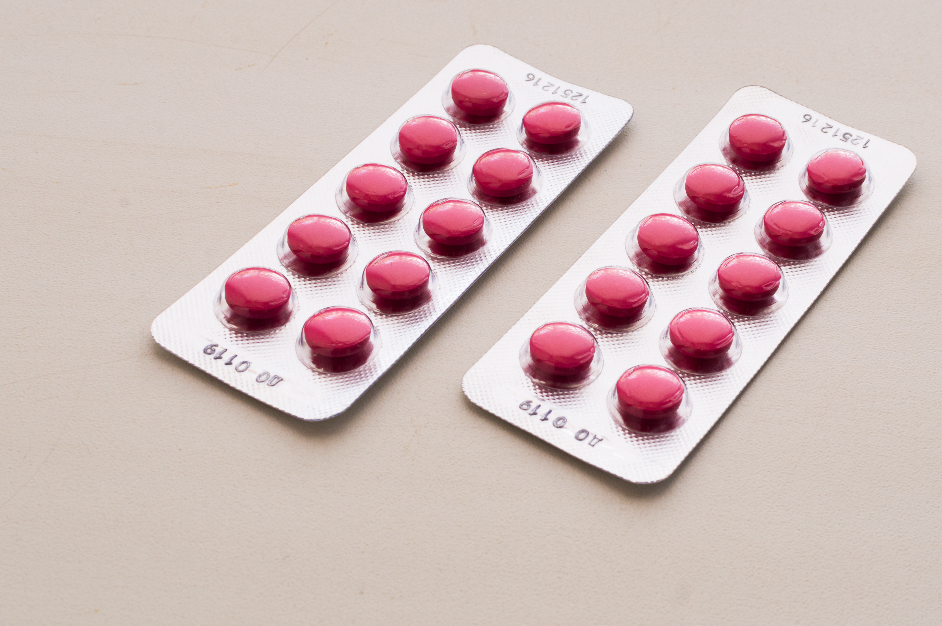 Two blister packs of pink pills on a light background