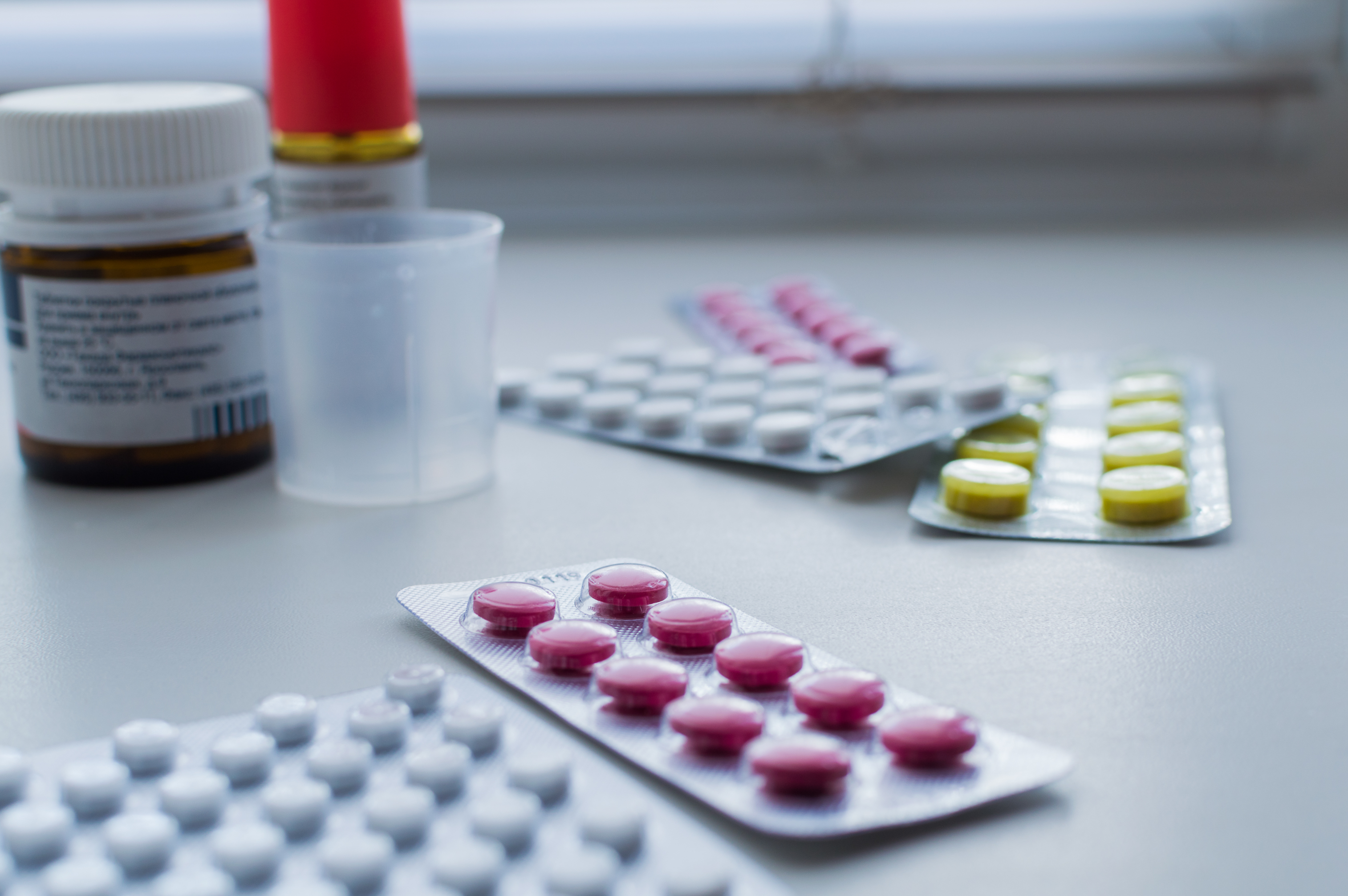 На этом изображении представлена композиция из различных лекарственных средств, расположенных на светлой поверхности, предположительно столе или подоконнике. В фокусе внимания находятся несколько блистеров с таблетками разных цветов и форм. Один блистер содержит таблетки ярко-розового цвета, аккуратно уложенные в ряд. Рядом видны блистеры с белыми таблетками, частично использованные, что создает ощущение реального использования. Также присутствует блистер с желтыми таблетками, которые выглядят объемными и гладкими.