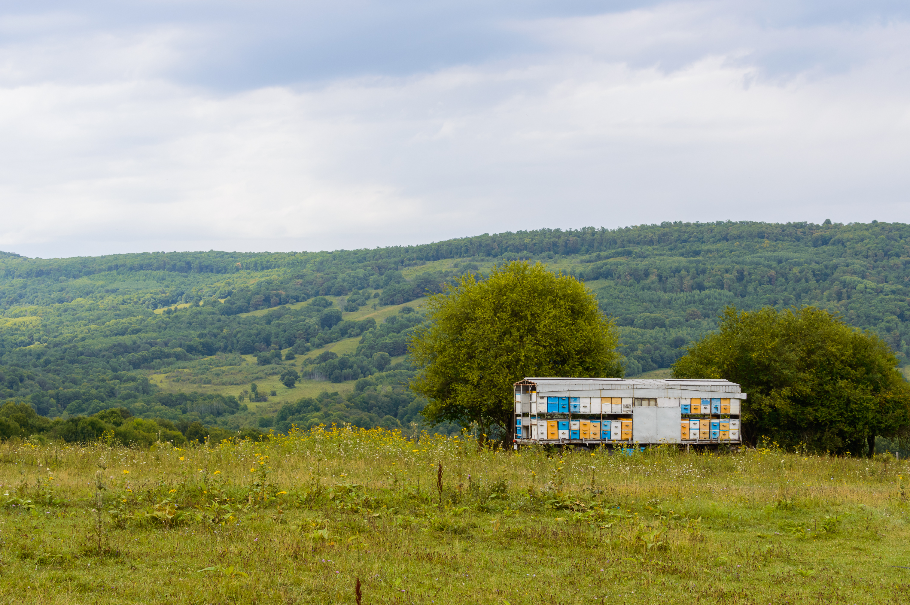В центре композиции располагается мобильная пасека, представляющая собой ряд ярко раскрашенных ульев. Их разноцветные фасады — синие, желтые и белые — выделяются на фоне зелени, но не нарушают гармонии природы, а скорее подчеркивают ее богатство. Ульи аккуратно расставлены, свидетельствуя о заботе и порядке, царящих здесь. Два раскидистых дерева обрамляют пасеку, добавляя ей уют и защищенность.