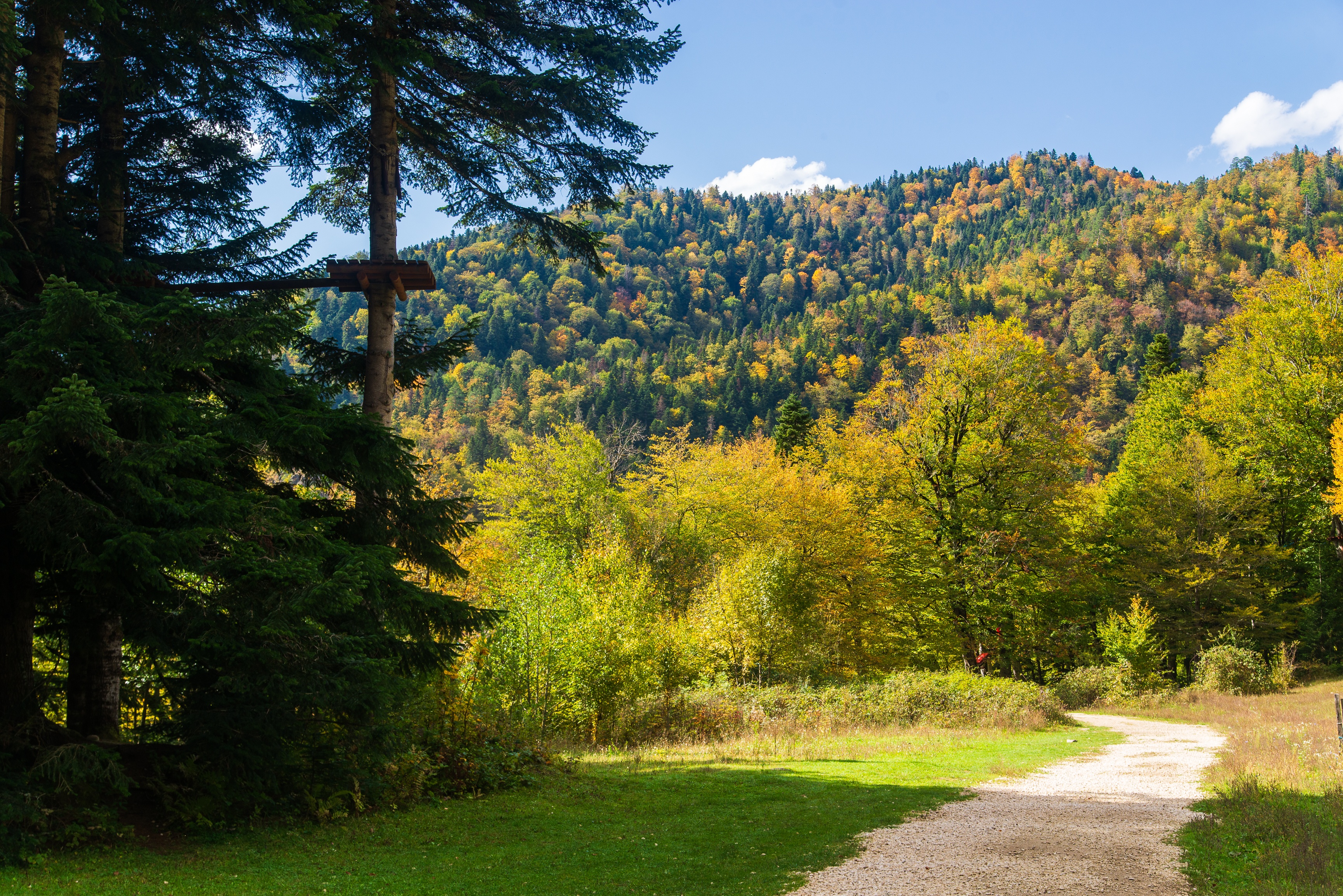 Это захватывающее изображение показывает извилистую гравийную дорогу, проникающую сквозь живописный осенний лес в горах Адыгея. Сцена разворачивается под ясным голубым небом с рассеянными белыми облаками, предлагая широкий вид на холмистые склоны, покрытые яркой листвой — желтыми, оранжевыми и зелеными оттенками, которые создают невероятный пейзаж. Слева высокие хвойные деревья обрамляют композицию, в то время как листопадные деревья вспыхивают осенними красками по краям тропы. Солнечный свет окутывает сцену теплыми золотистыми тонами, усиливая текстуры коры древесины, травянистые участки и гравий под ногами. На горизонте лесные склоны мягко возвышаются, демонстрируя величие горы.