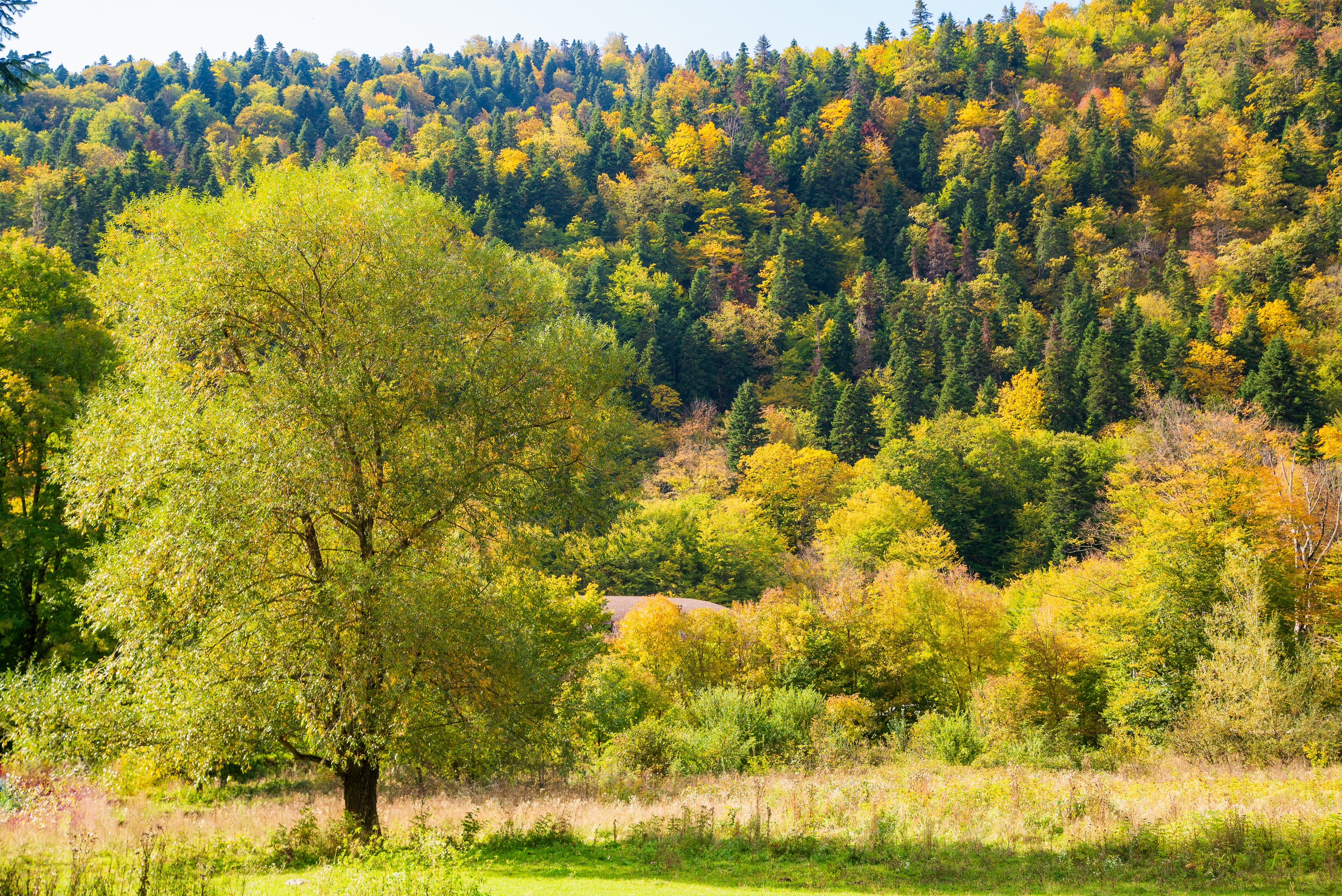 Это захватывающее изображение демонстрирует потрясающий осенний пейзаж Адыгеи, где холмы покрыты яркой мозаикой золотых, жёлтых и зелёных листьев. Лес полон сезонной трансформации — лиственные деревья демонстрируют свои блистательные осенние краски на фоне вечнозелёных хвойных пород. На переднем плане, отдельное дерево с пышными зелеными листьями создает яркий контраст с цветным пространством за ним.