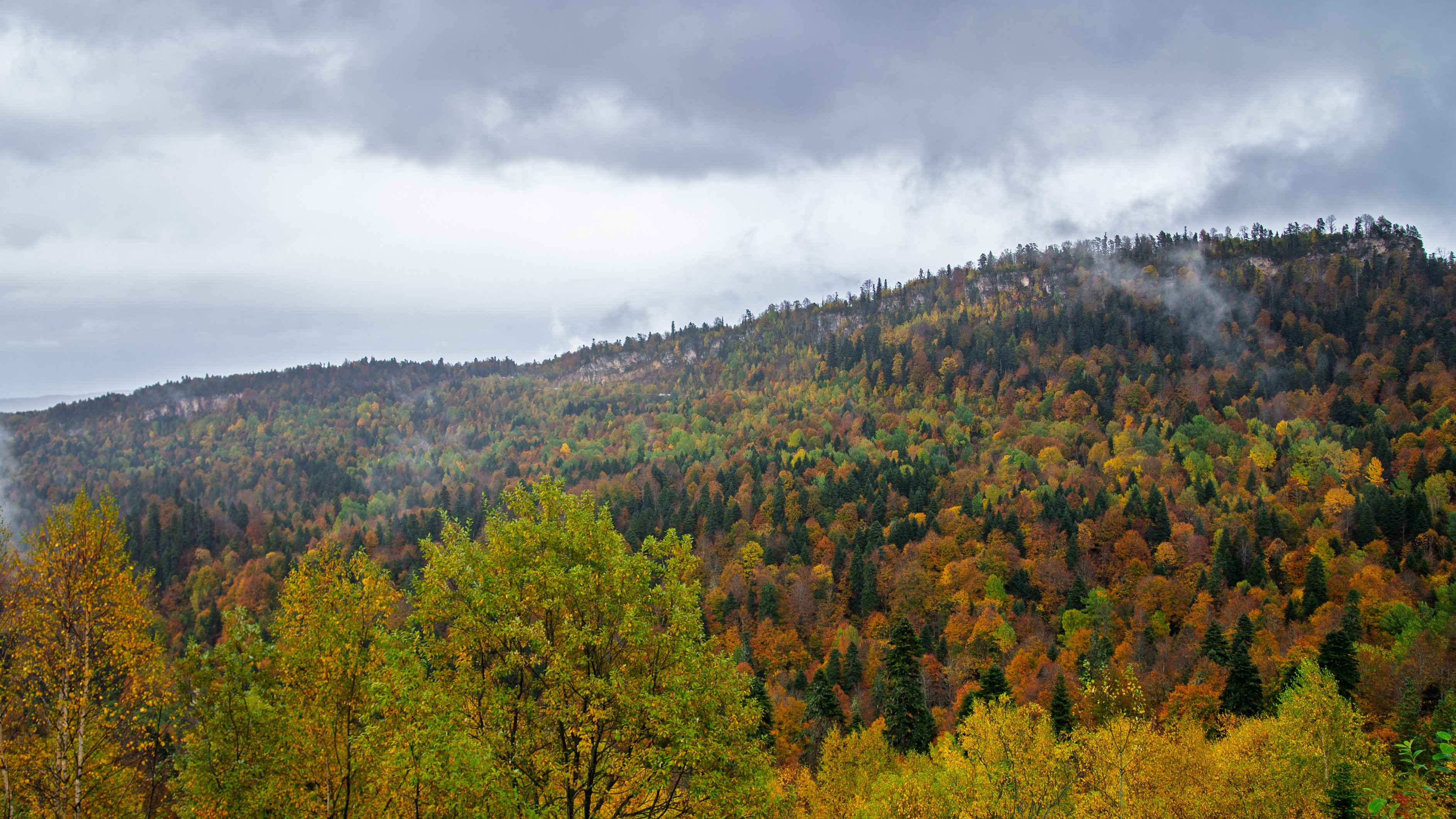 The foreground features tall deciduous trees with leaves transitioning through warm autumnal shades, while coniferous evergreens punctuate the midground with dark green contrasts. The lighting is diffused by thick cloud cover, casting even illumination across the scene without harsh shadows. This soft, atmospheric light enhances the vividness of the foliage and reveals intricate details in bark textures and leaf patterns. The camera’s wide-angle lens captures the sweeping panorama, emphasizing the vastness and scale of this untouched natural environment.