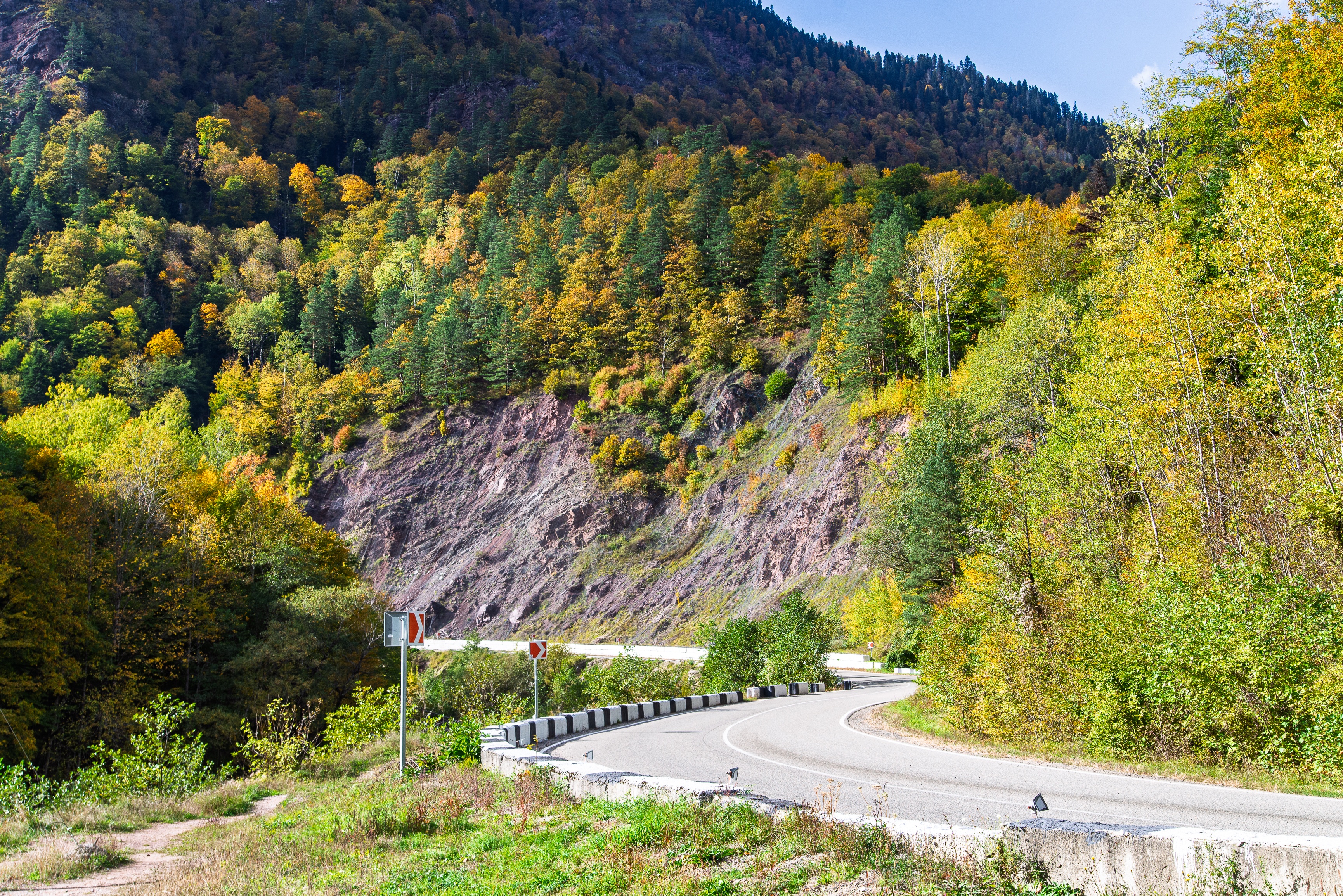 Это захватывающее изображение запечатлело вьющуюся асфальтовую дорогу, пронзающую безупречно красивый осенний лес Адыгеи, расположенный на склонах горы. Сцена раскрывается под ясным голубым небом, где солнечный свет фильтруется через густые кроны хвойных и лиственных деревьев, их листья огненно-желтые, золотые, оранжевые и глубокие зеленые. Видна скальная откосность, добавляющая текстурную контрастность к обильной растительности. Дорога, ограниченная бетонными ограждениями и временами дорожными знаками, извивается вдаль, приглашая исследовать. Это не просто пейзаж — это полное погружение: запах влажной земли, шуршание листьев, свежий горный воздух, всё способствует ощущению спокойного одиночества. Композиция искусно сочетает передний план с дикими травами и кустарниками, среднюю часть с деревьями и задний план с горными вершинами, создавая глубину и перспективу. Это вызывает чувство путешественника, тишины и восхищения — идеально для туристов, фотографов природы или любого, кто ищет вдохновение в первозданной красоте горного рельефа осенью.