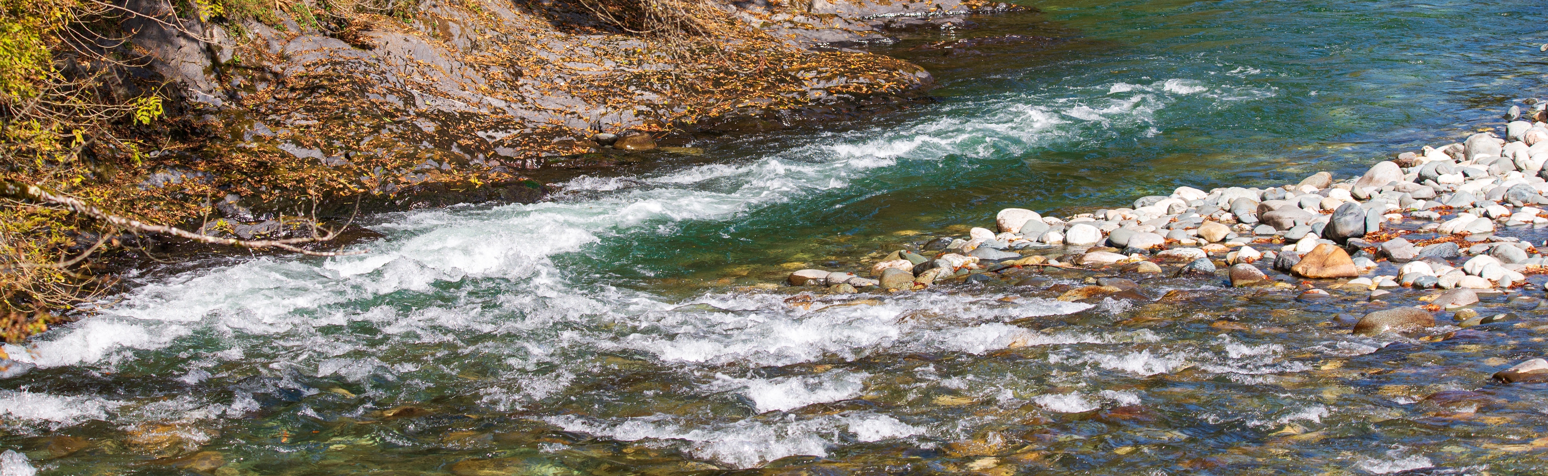 Это захватывающее изображение передает суть осени в горной реке Адыгеи, где прозрачная бирюзовая вода стремительно течет по гладким камням и гальке. Берега украшены золотистой листвой, намекая на сезонный переход от лета к осени. Динамический поток воды создает белые пенящиеся узоры, когда она бьется о камни, прекрасно контрастируя с глубокими зелеными тонами камней, скрытых под поверхностью. Солнечный свет проникает через окружающие деревья, создавая пятна света и усиливая яркость естественной палитры.