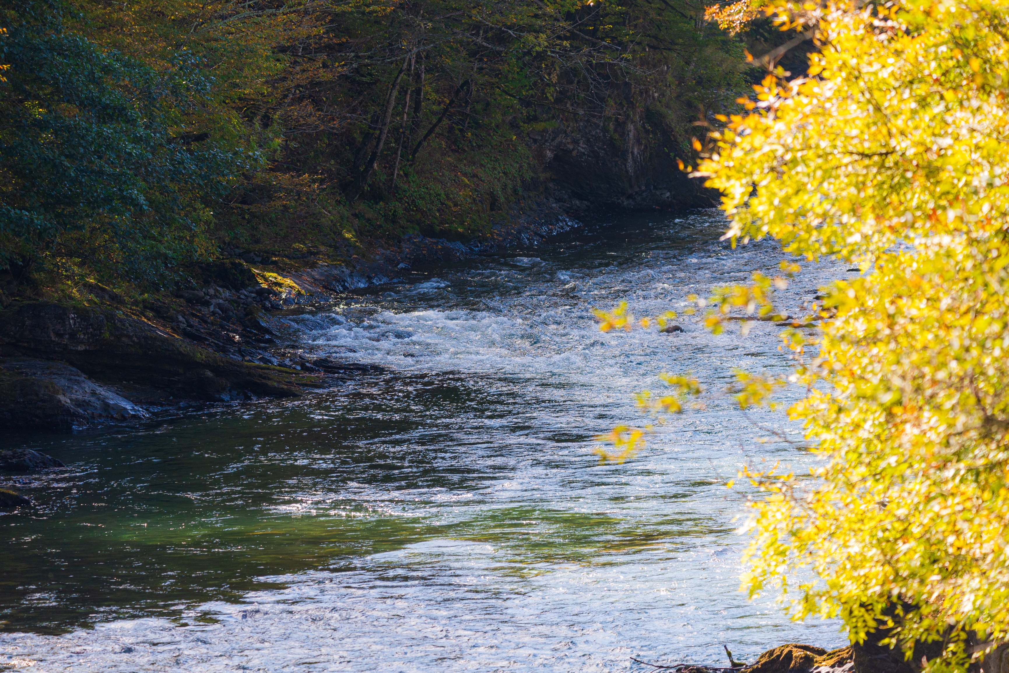 The atmosphere conveyed is deeply peaceful and contemplative, evoking feelings of solitude and awe inspired by nature’s seasonal transformations. There's a sense of quiet movement as the water flows steadily while leaves gently sway in the breeze — an almost meditative rhythm that invites stillness. The image radiates warmth through its golden tones without overwhelming brightness; instead, it offers gentle illumination that enhances depth rather than flattening detail. Artistically, this photograph balances realism with poetic expression — capturing both objective reality (the river’s path, tree species) and subjective emotion (calmness, wonder). It appeals to audiences who appreciate nature photography for its ability to convey emotional resonance through visual storytelling. This scene could be used in mindfulness content, eco-tourism marketing, or as an artistic wallpaper celebrating the beauty of autumnal landscapes — it embodies the essence of natural serenity and seasonal renewal.