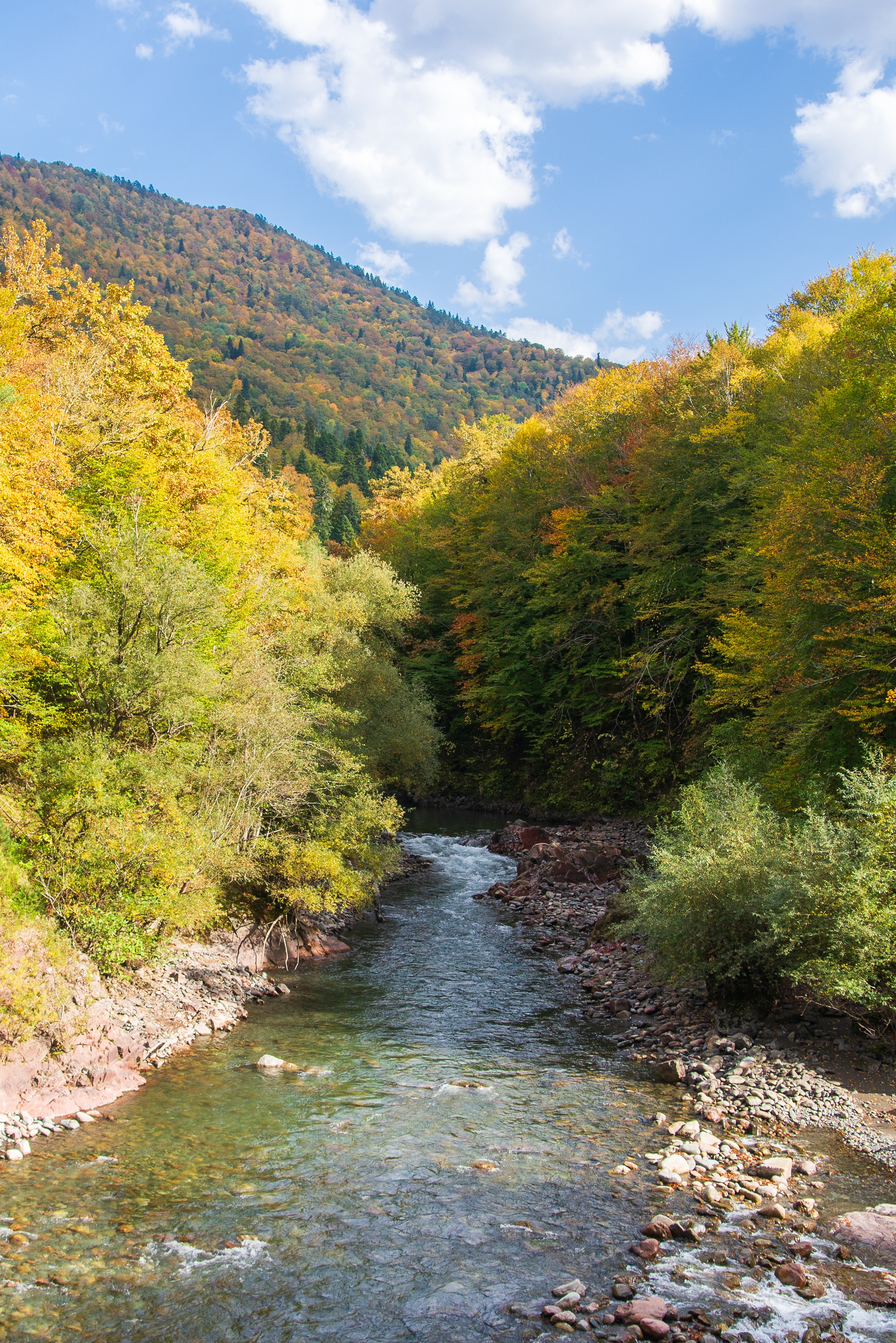 This stunning photograph captures a tranquil autumn river winding through a lush forest valley in Adygea, Russia. The scene unfolds under an expansive blue sky dotted with soft white clouds, casting natural sunlight that enhances the vivid hues of the foliage. The water flows gently over rocks and pebbles, reflecting the surrounding greenery and golden leaves. The composition balances dynamic elements like the flowing river against static beauty such as towering trees and distant mountains, creating a harmonious visual rhythm.