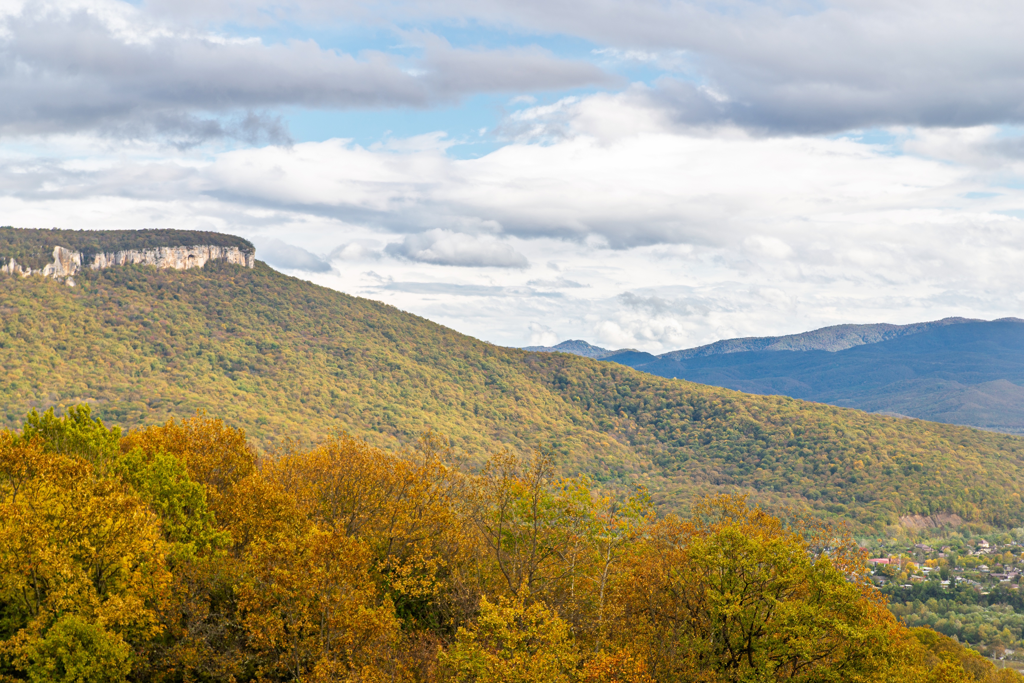 This image captures a stunning autumn landscape, where hills are covered in colorful foliage — ranging from golden-yellow to deep green. In the distance, a rocky cliff stands out against clouds and a blue sky. In the foreground, trees with bright leaves create a sense of depth and space. A small settlement can be seen in the distance, nestled among the greenery. The scene was captured on a clear day, when soft light illuminates the landscape, highlighting the texture of leaves and the contours of cliffs. The composition is balanced, with trees in the foreground and a deep background including hills and sky. This scene is ideal for use in advertising, tourism catalogs, and as a background for websites related to nature and leisure.