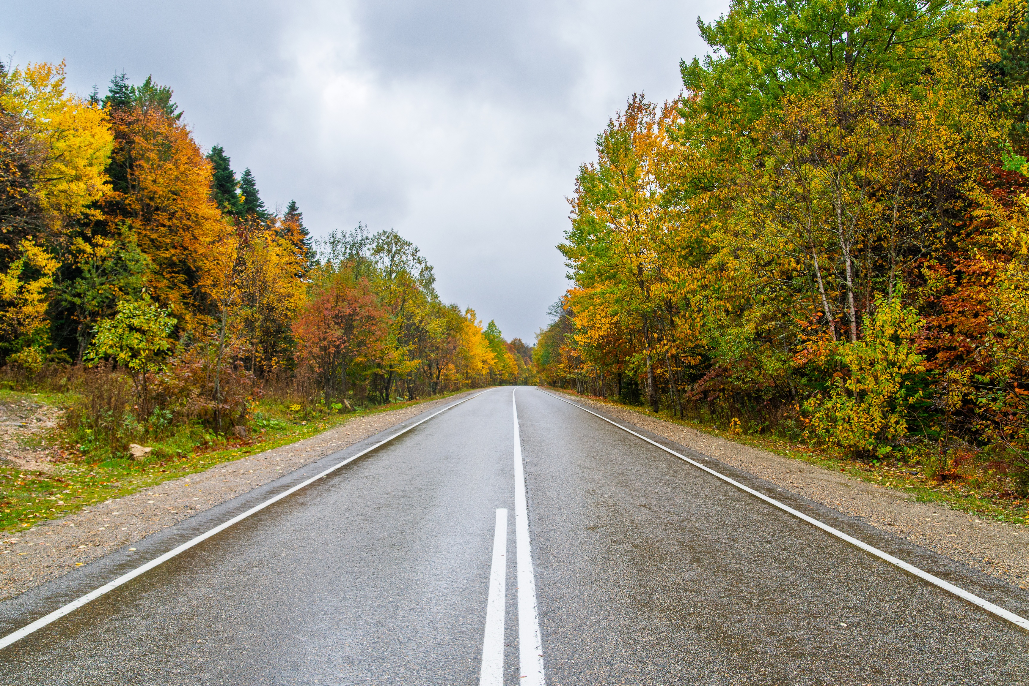 На изображении — мокрая асфальтовая дорога, уходящая вдаль между двумя рядами осенних деревьев, окрашенных в яркие оттенки желтого, оранжевого и зеленого. Небо пасмурное, серое, что придает сцене спокойную, чуть меланхоличную атмосферу. Дорога выглядит как тонкая белая линия, разделяющая лес, и ведет взгляд зрителя вглубь края кадра, создавая ощущение перспективы и одновременно пустоты. Сцена передает умиротворение и тишину, как будто в лесу нет ни души, только природа и дорога.