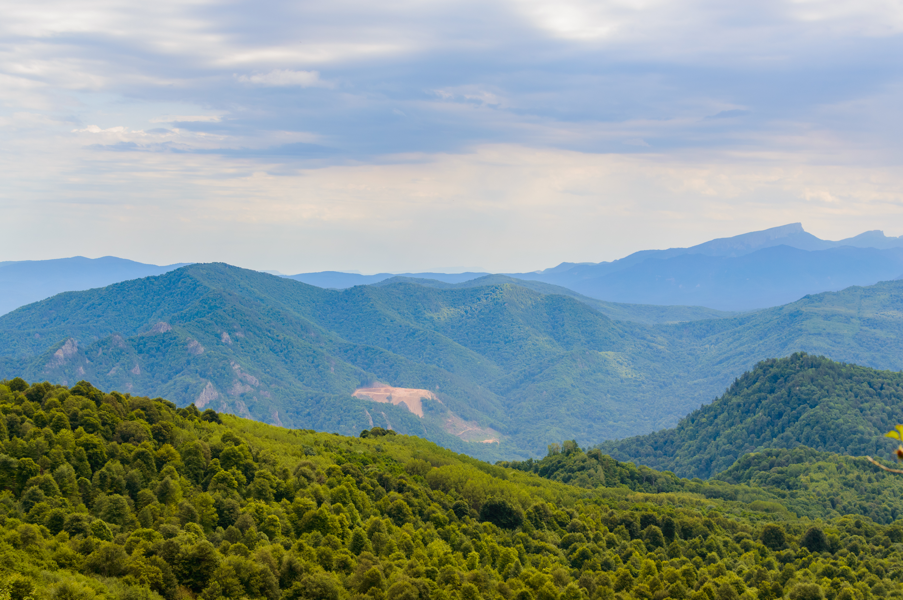 Передний план фотографии занят густым лесом, который кажется почти бархатным на вид. Дальше, в глубине кадра, видны участки с вырубками или обнаженной землей, напоминающие о присутствии человека в этом величественном природном ландшафте. Тем не менее, преобладание зелени и масштабы гор полностью доминируют, создавая впечатление дикой и нетронутой природы.