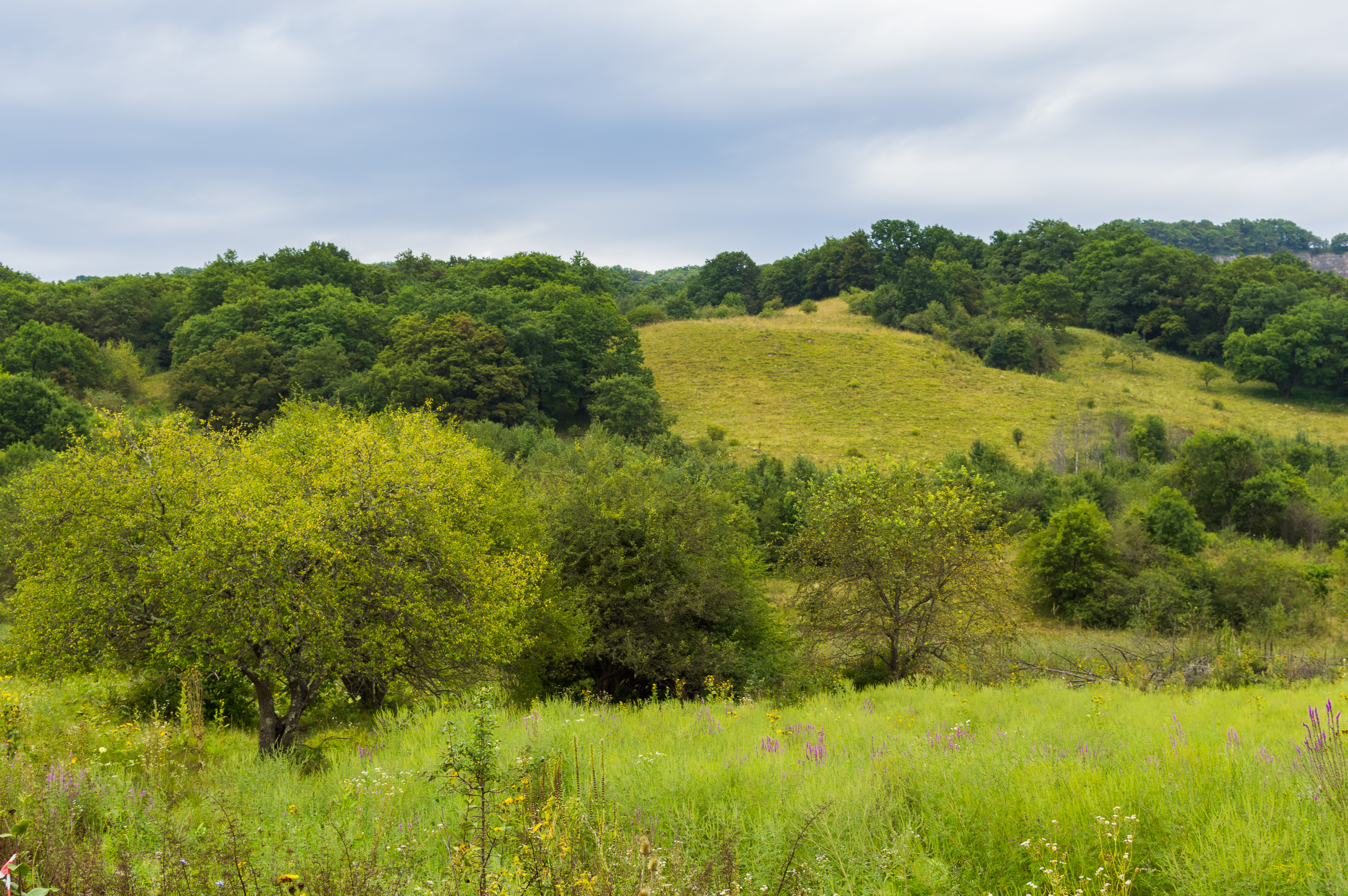 За лугом возвышается пологий холм, его склон ярко освещен, создавая контраст с более темными участками. На вершине холма и далее по склону простирается густой, многослойный лес, его деревья плотно прилегают друг к другу, образуя непроходимую зеленую стену. Лес выглядит пышным и здоровым, свидетельствуя о плодородности земли.