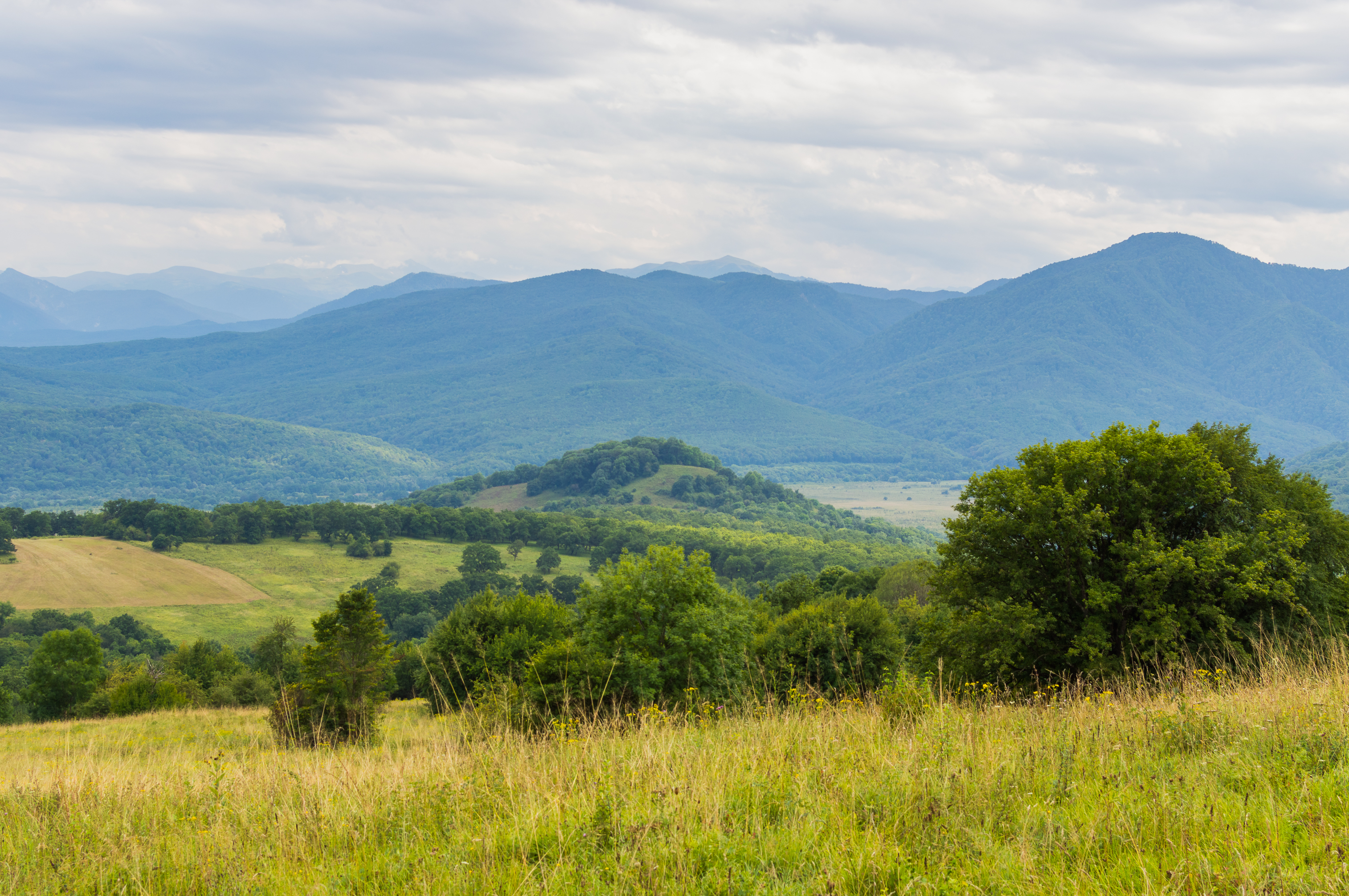 Передний план снимка украшен высокой, слегка выгоревшей на солнце травой, которая создает ощущение летнего луга. Среди травы виднеются редкие полевые цветы, добавляющие яркие акценты в общую картину. По мере удаления взгляд скользит по склонам, покрытым густыми лесами, чья зелень кажется особенно насыщенной.