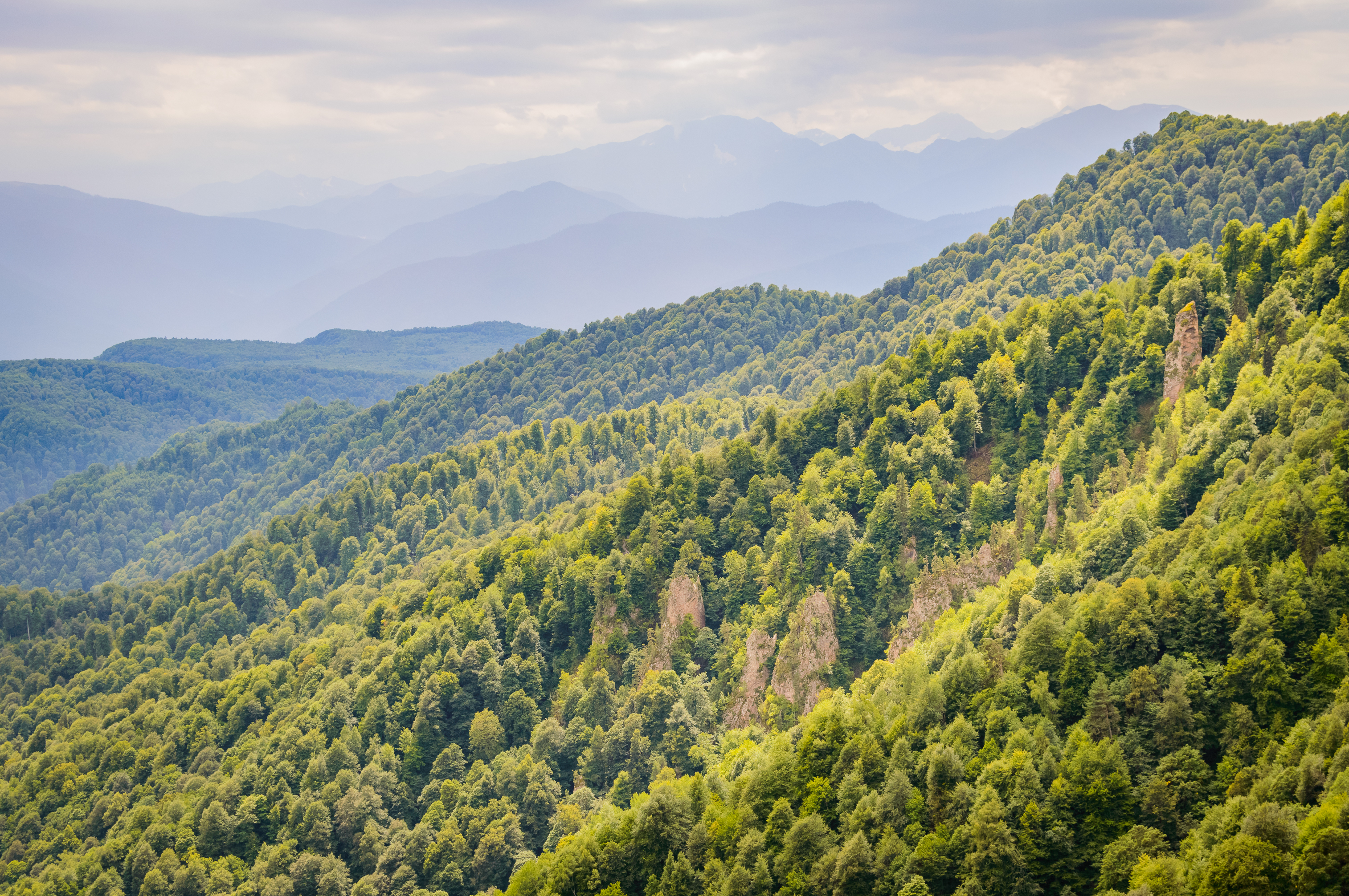 Время съемки, вероятно, первая половина дня или ближе к вечеру, когда свет становится более мягким и рассеянным, что способствует образованию мягких теней и нежных переходов цвета. Пасмурное небо, характерное для летних горных дней, не омрачает красоту пейзажа, а, наоборот, усиливает его таинственность и спокойствие. Оно создает идеальный фон для яркой зелени, предотвращая пересветы и позволяя деталям рельефа проявиться.