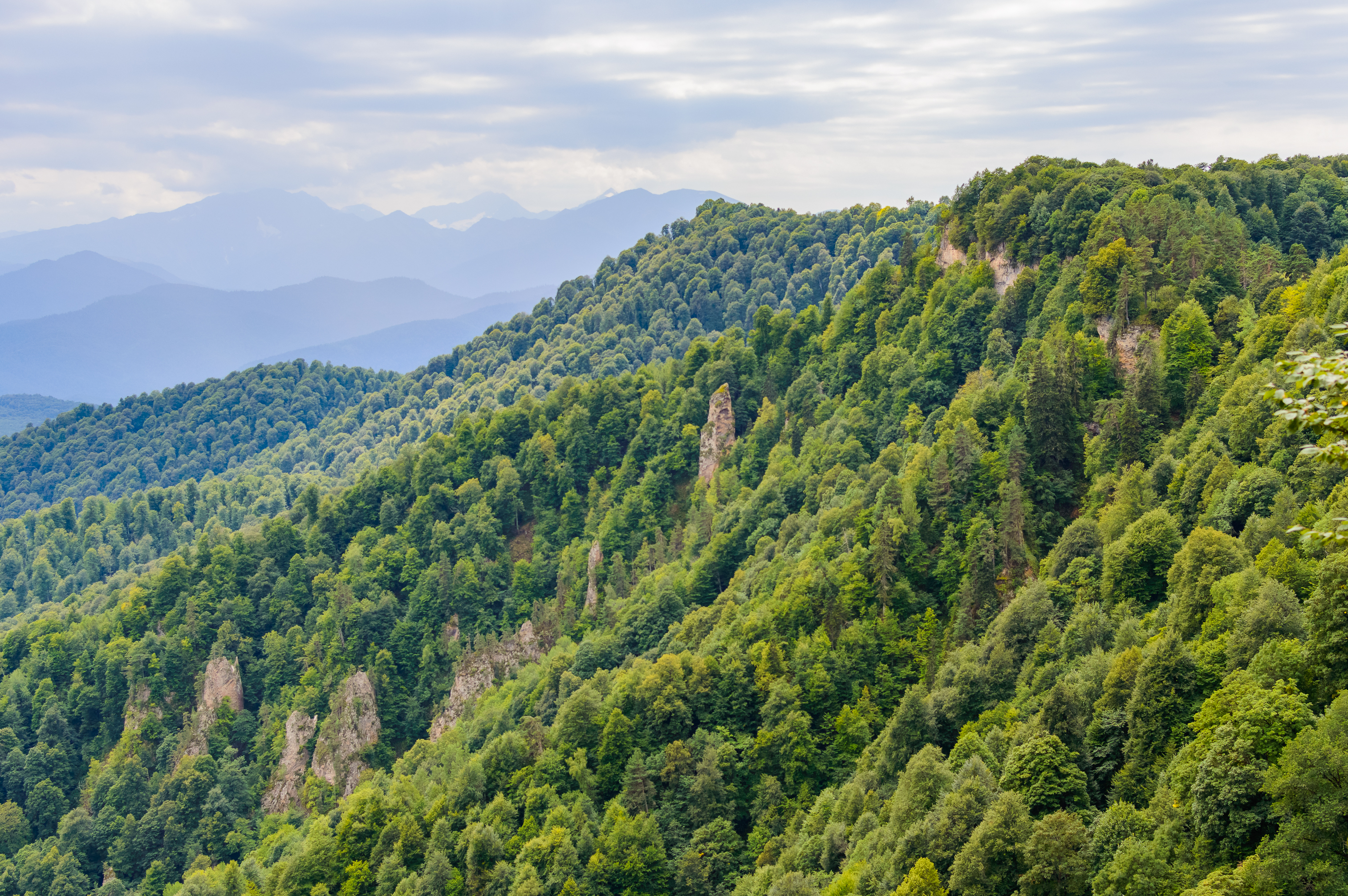 Перед вами захватывающий вид на горный массив, окутанный зеленью и облаками, который, вероятно, был запечатлен в летний или ранний осенний день. Солнечный свет, пробивающийся сквозь плотные облака, создает мягкое, рассеянное освещение, которое подчеркивает глубину и объем пейзажа. Темные оттенки зеленого, покрывающие склоны гор, говорят о густых лесах, возможно, состоящих из лиственных деревьев, чья листва достигла пика своей пышности.