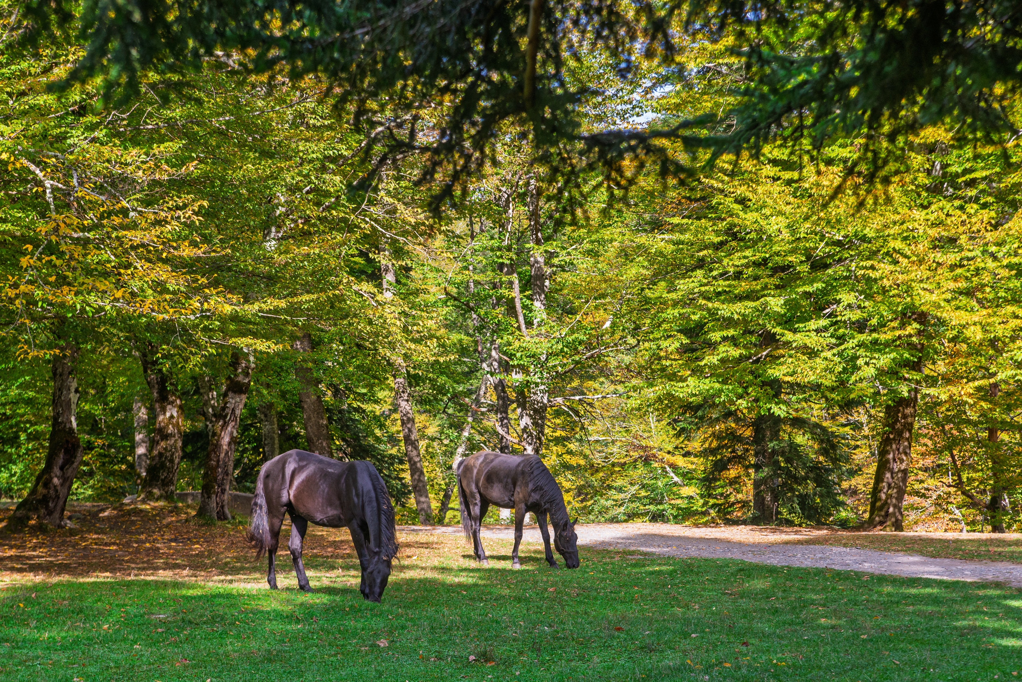 Это захватывающее изображение показывает двух темных лошадей, спокойно пасущихся в густом зелёном лесу Адыгеи. Сцена окутана тёплым золотистым солнечным светом, проникающим сквозь густую крону деревьев с ярко-зелёными и жёлто-зелёными листьями, создавая пятна на траве ниже. Пол леса покрыт богатой зелёной растительностью, а древние стволы деревьев возвышаются вокруг укрытия, указывая на древнюю лесную местность. Тонкая тропинка или дорога тянется за лошадьми, приглашая исследовать глубже этот спокойный естественный ареал.
