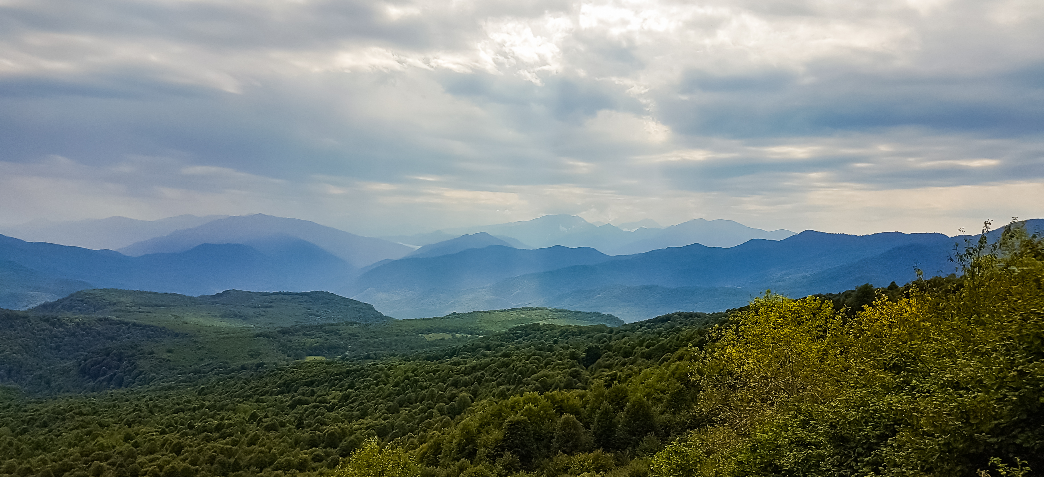 This captivating mountain landscape transports the viewer into a world of tranquility and natural grandeur. Vast expanses unfold before us, where each layer of mountains recedes into a haze, creating a sense of depth and infinity. The bluish peaks, shrouded in a light mist, contrast with the lush green of dense forests covering the foothills.